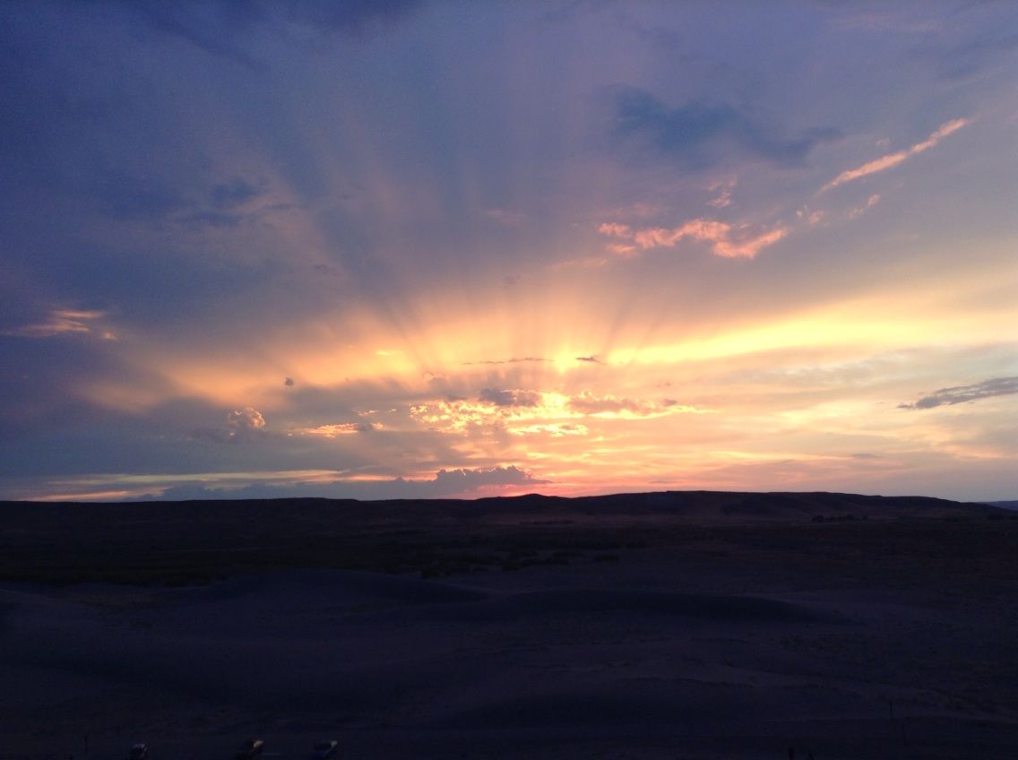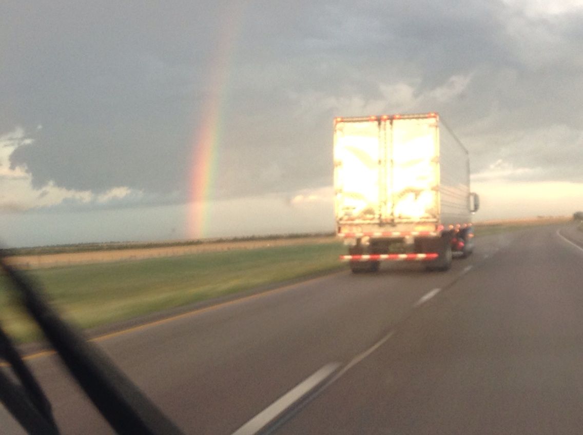 インターステイツ80は,ネブラスカ州に入ると,背後に夕日が輝き,北には稲妻が光り,目の前の東側には,虹が見えて,上空の真っ黒い雲から雨が降ってきて,まっすぐに続く道路以外何もないという,とんでもない光景になりました。