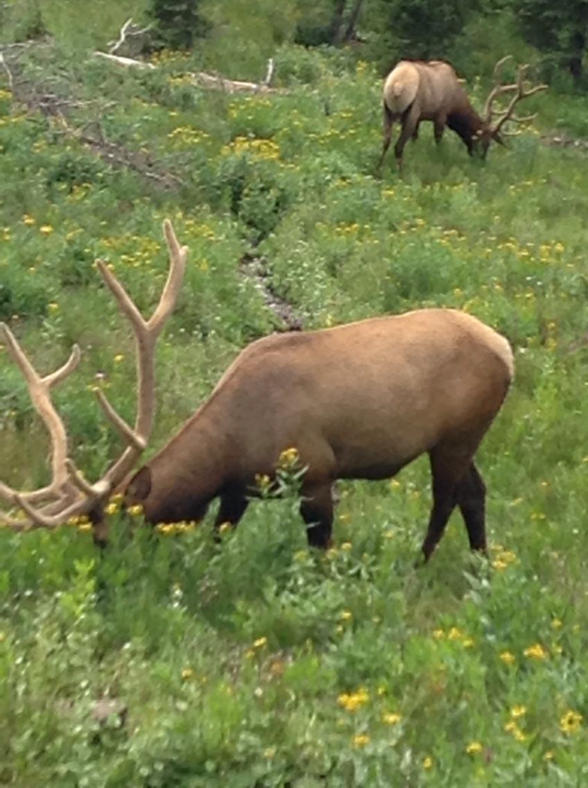 下山途中で,野性のエルクが3頭,草を食べているのに遭遇しました。