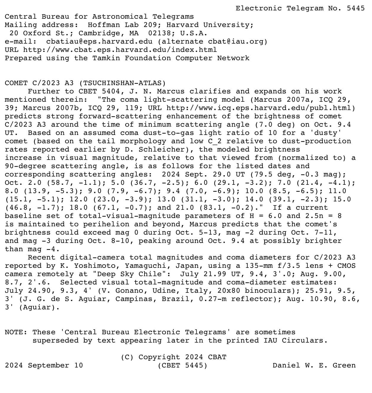 この天体が小惑星センターのNEOCP webpage (その後 PCCP webpageに移動)に公表後,R.Weryk(西オンタリオ大学物理および天文学科)は,1月6.5日UTにJ.Fairlambがハワイ島マウナケア(Maunakea)にあるハワイ大学2.2メートル反射望遠鏡を使って1.3秒のシーイングで得た3枚の60秒のフォローアップCCD画像を測定した。さらに,R.Werykは,2月21.25日,マウナケアにある3.6メートルCanada-France-Hawaii望遠鏡を使って0.5秒のシーイングで得た3枚の60秒のgri-バンド画像では,非常に集光した0.6秒(半値全幅:FWHM)の頭部が見え,p.a.95度に約2秒の短い尾があるとつけ加えた。また,R.Werykは,その後,12月2.5日に22.1等から22.2等,12月6.5日に22.0等から23.1等,12月22.6日に22.2等から23.0等,マウイ島ハレアカラ(Haleakala)にあるPan-STARRS2 1.8メートルRitchey-Chretien反射望遠鏡で得た発見前の画像では,2024年11月28.5日に23.6等,12月6.5日から6.6日に23.1等,12月23.44日から23.48日に21.7等から22.2等,12月30.6日に21.3等から21.9等で,ハレアカラにあるPan-STARRS1 1.8メートルRitchey-Chretien反射望遠鏡で得た画像とこの彗星を同定した。