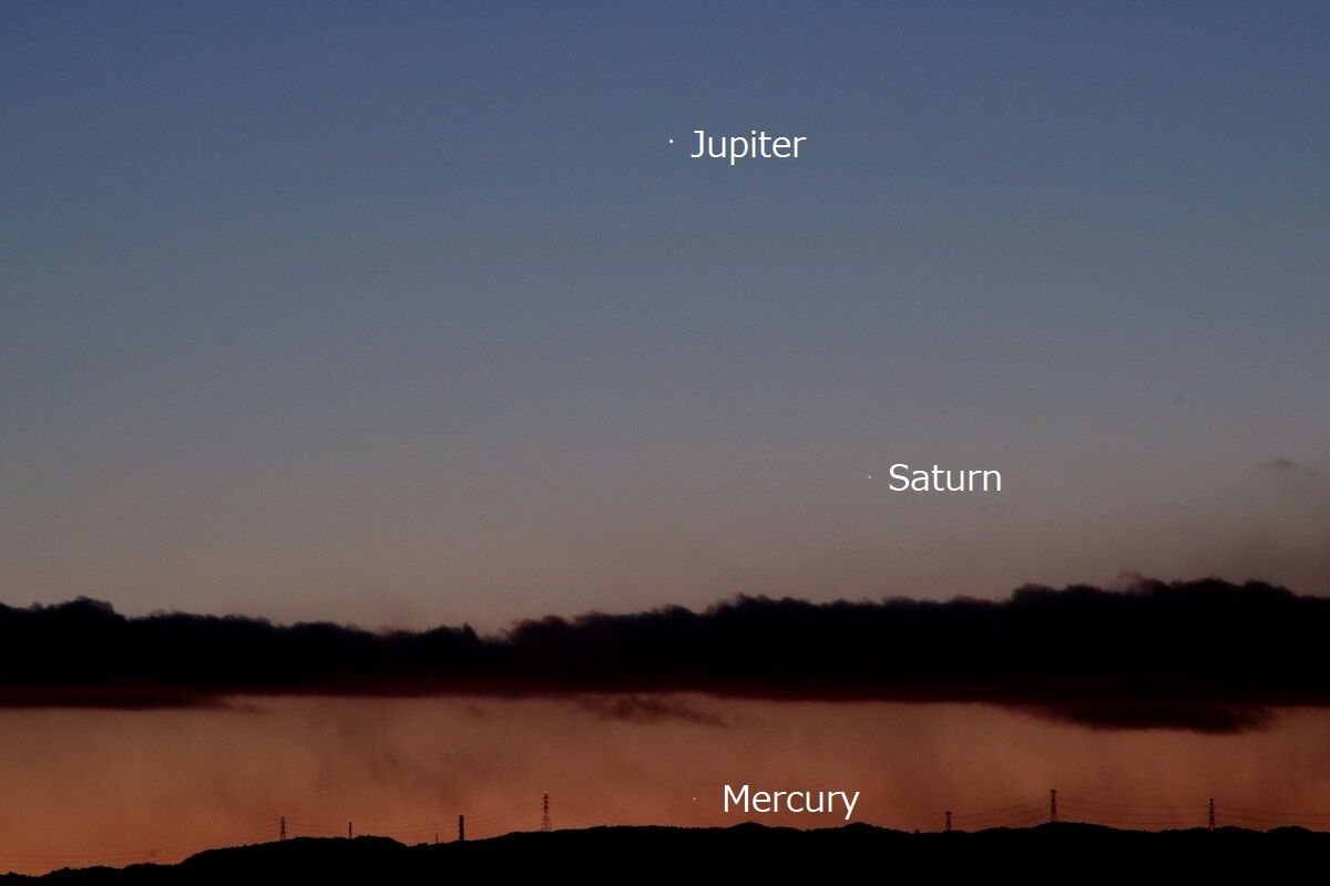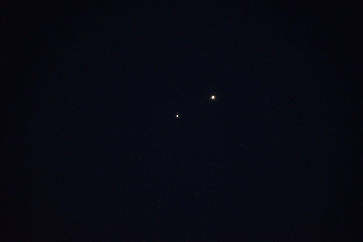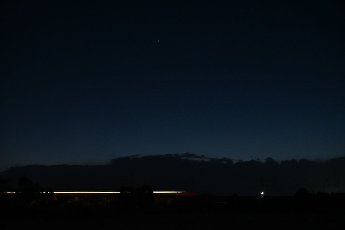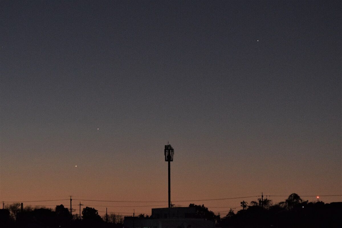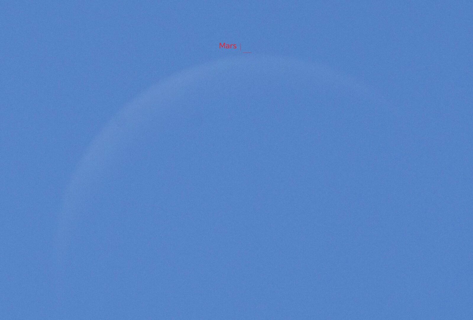 予報された時刻が近づいたので,シャッタースピードをいろいろと変えて,月を写しました。金星に比べて火星は暗いので,露出をかけなければならないのですが,そうすると空の明るさに負けてしまい,その塩梅がむずかしいのです。
