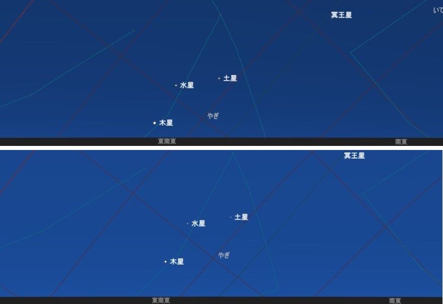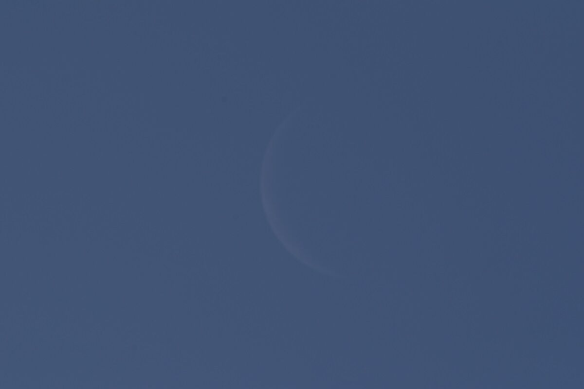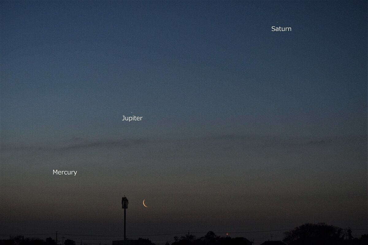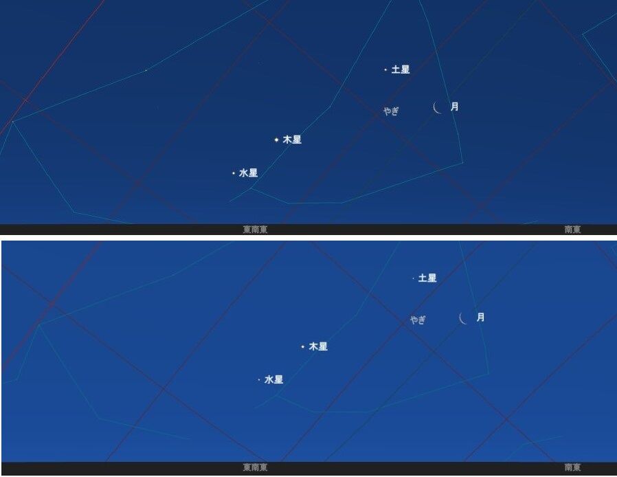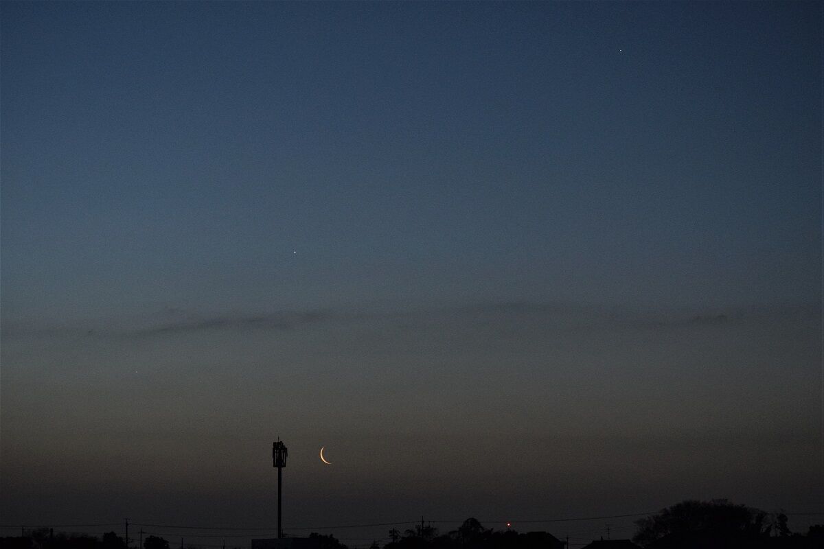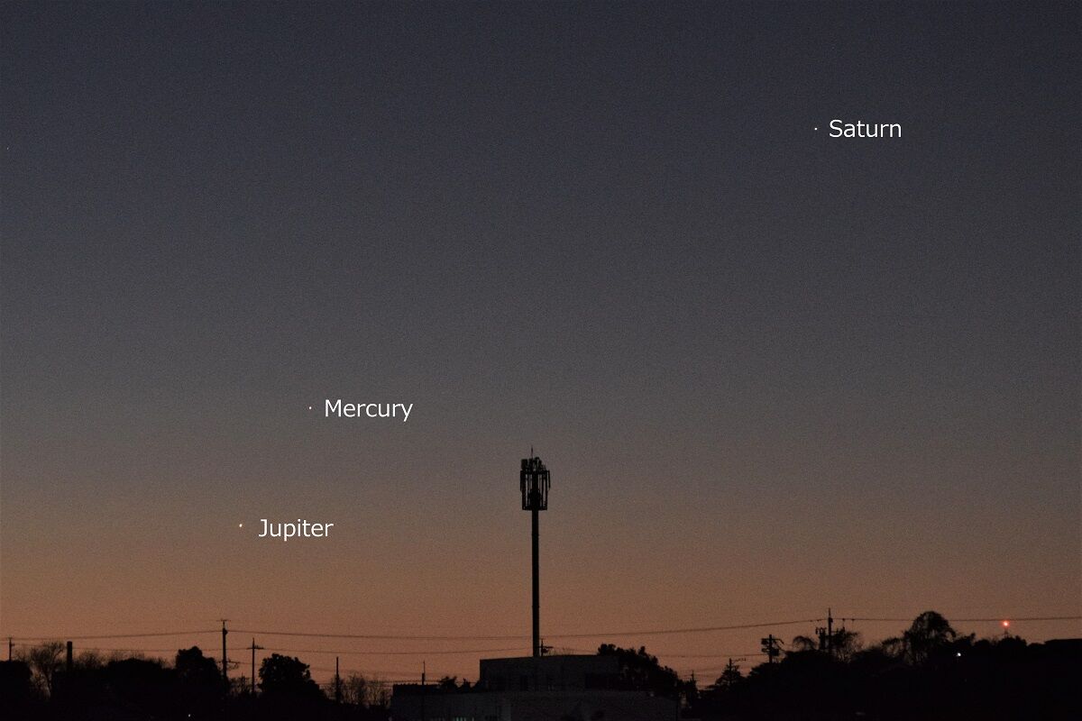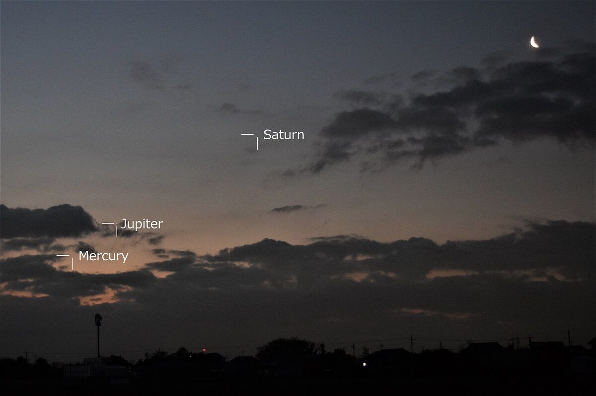 予報された時刻が近づいたので,シャッタースピードをいろいろと変えて,月を写しました。金星に比べて火星は暗いので,露出をかけなければならないのですが,そうすると空の明るさに負けてしまい,その塩梅がむずかしいのです。