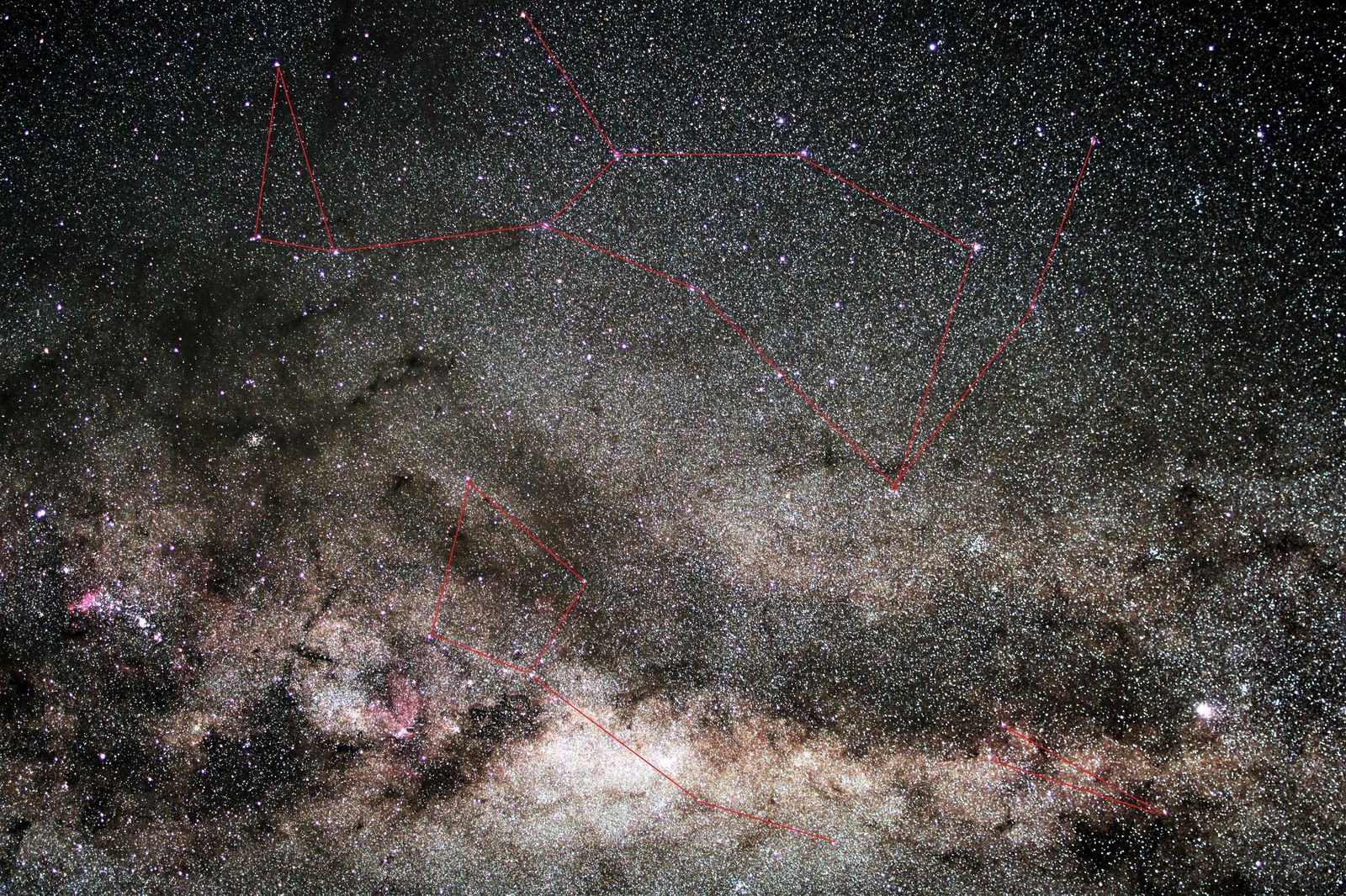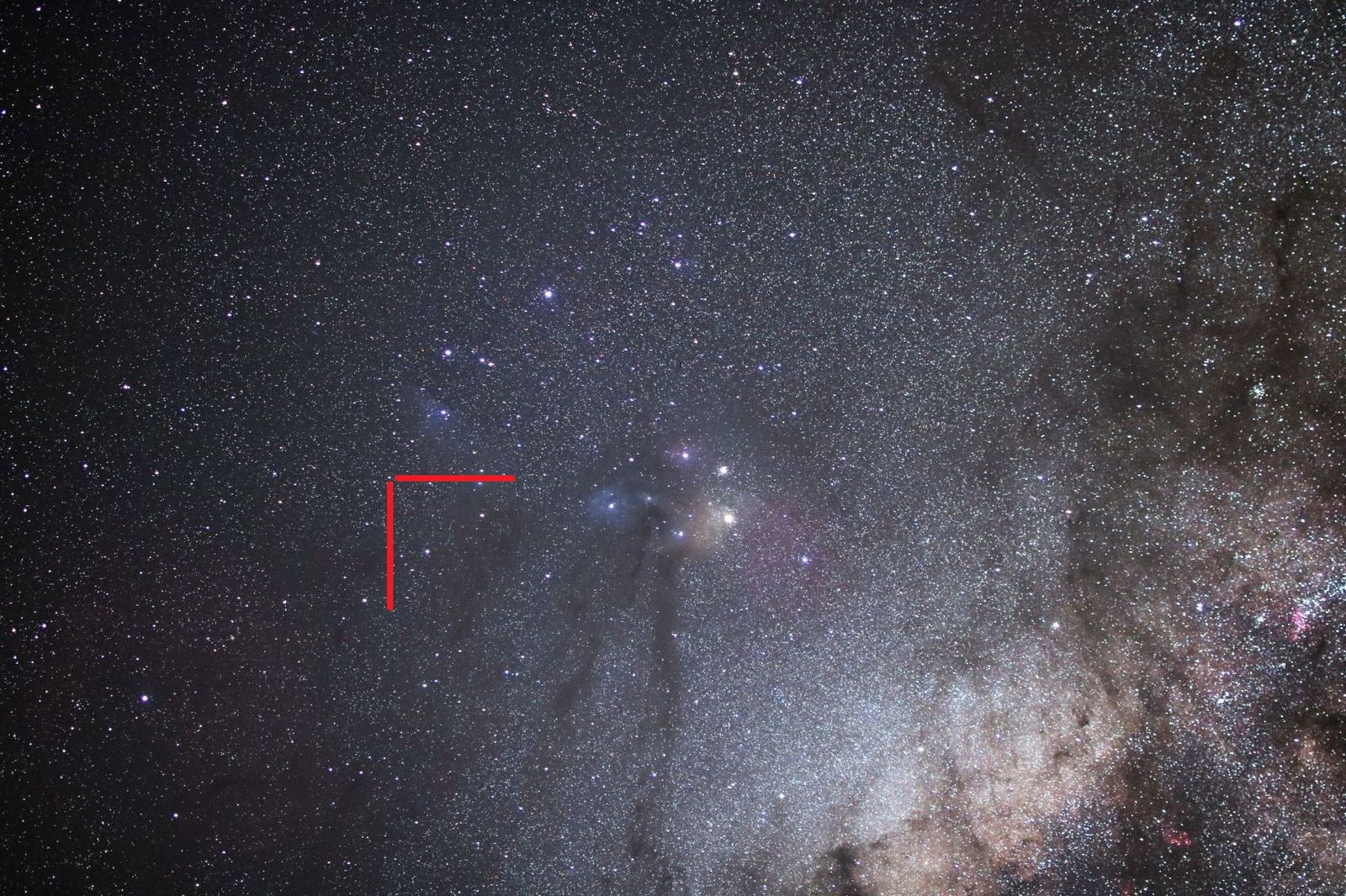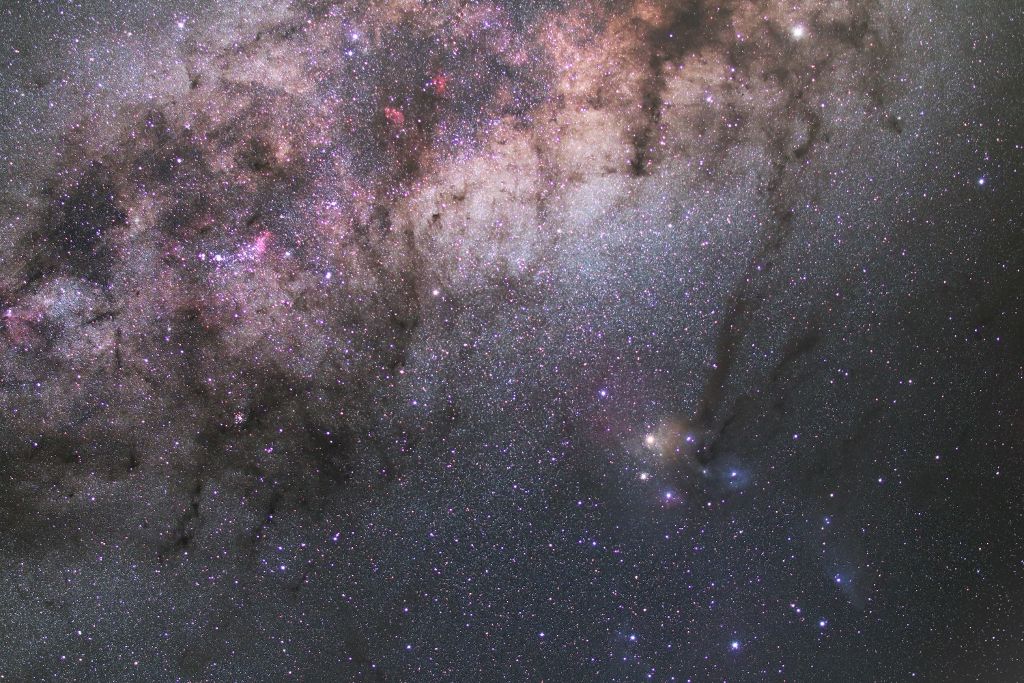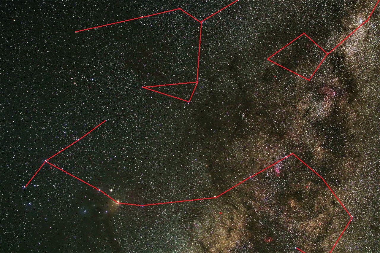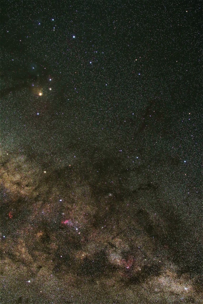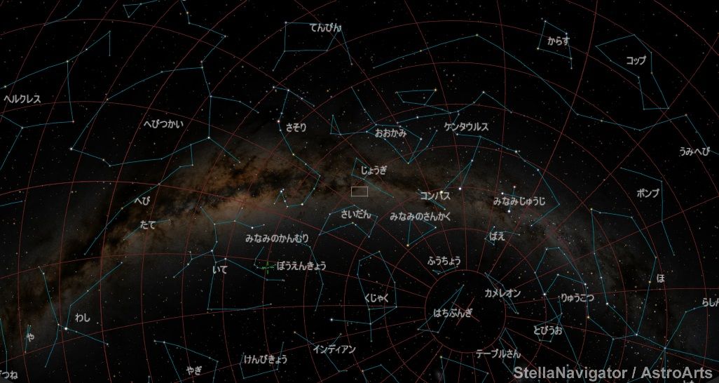 おおかみ座は空の明るい日本では地味で星の並びもわかりませんが,空の暗いオーストラリアでは,その並びからおおかみの姿が浮かび上がります。じょうぎ座のほうは天の川銀河が濃くて,溶け込んでしまっているので,むしろ星の並びを見つけるのは難しいものです。しかしこの辺りは,じょうぎ座の散開星団とともに,さそり座やいて座の散光星雲など,まるで宝石箱のようにおおくの美しい天体が輝いているので,とてもきれいです。