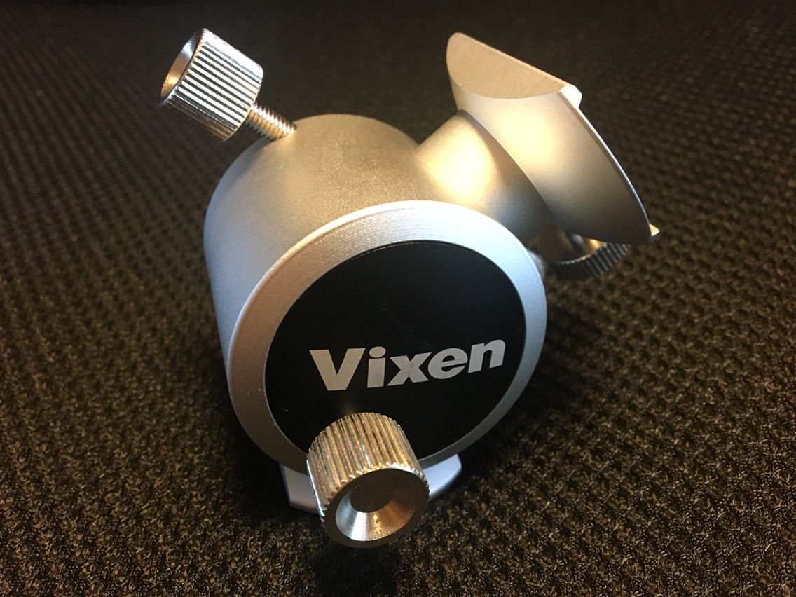 そこで,ポーラメータに加えて「極軸望遠鏡」を購入しました。その極軸望遠鏡を覗いて正確に極軸を合わせるわけですが,そのためには高度と方角の微調整ができなくてはなりません。そこでさらにあつらえたのが4番目の写真のようなビクセンのポラリエ専用の架台でした。
