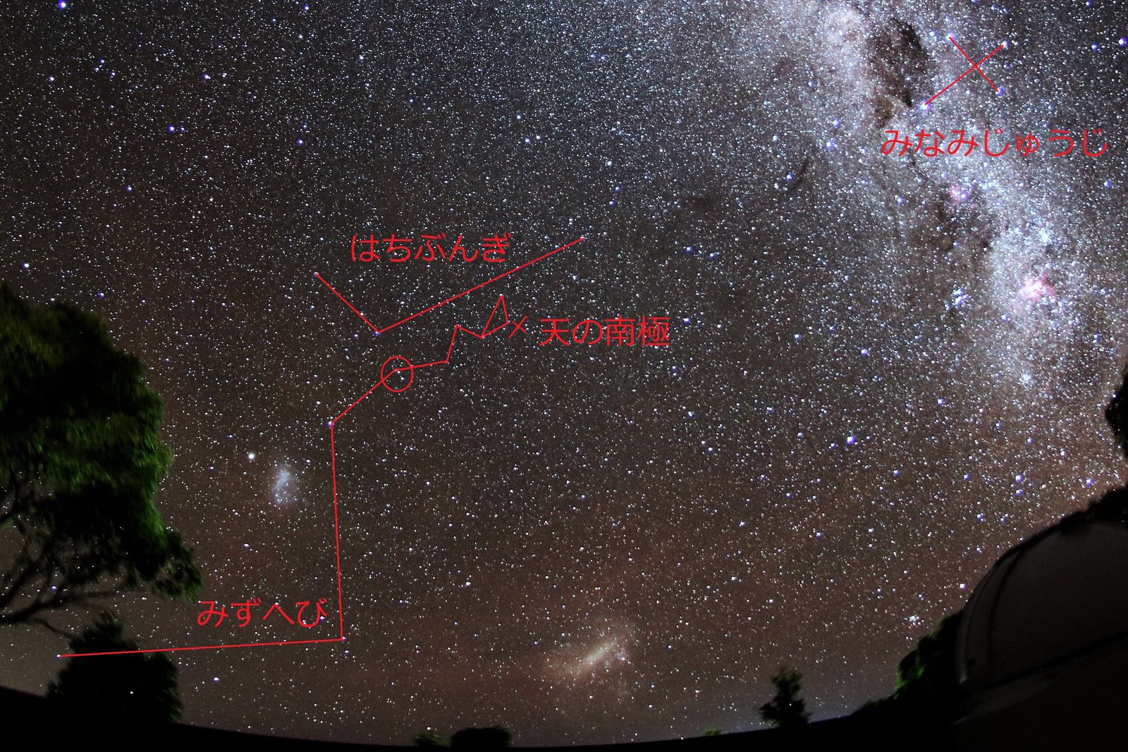1番目の写真は私が写した南天の極付近の写真に説明を加えたものですが,天の南極はみずへび座にある小マゼラン雲と南十字座をおよそ3:7に内分したところにあります。