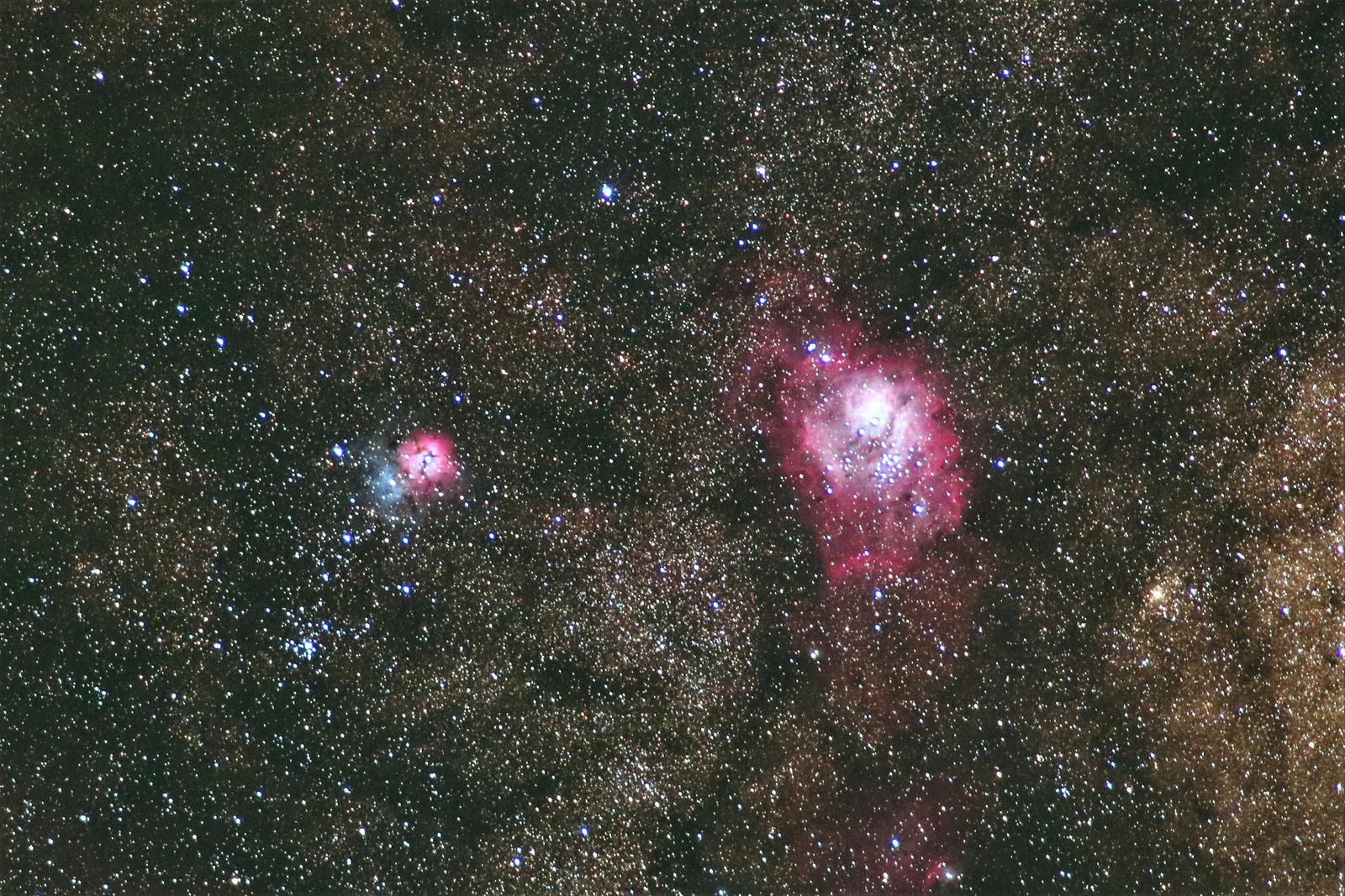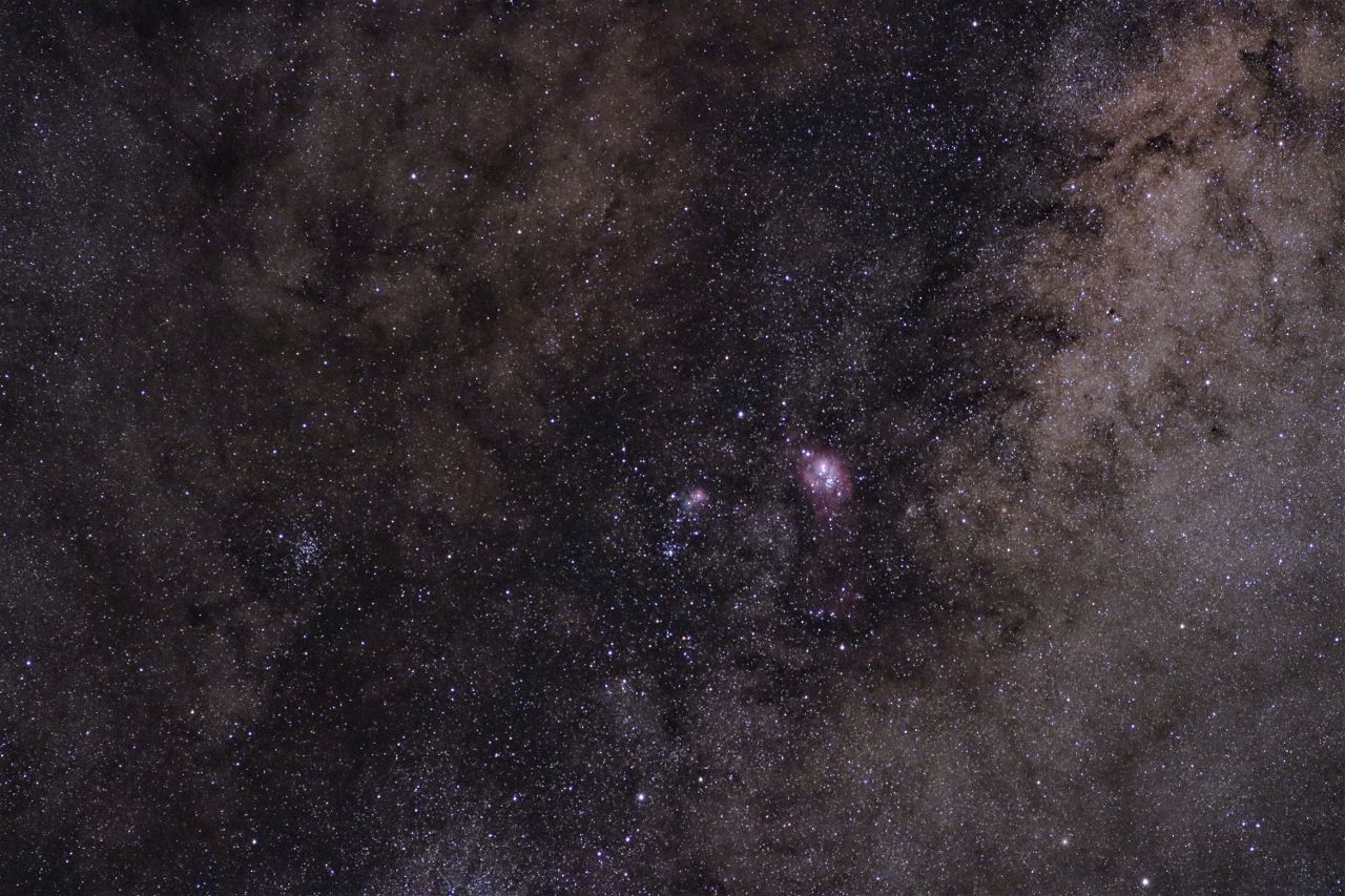 星雲と同じ位置に散開星団NGC6530も重なって見えます。 この星雲もまた,先日書いた走るにわとり星雲と同様,所々にボック・グロビュール(Bok globules)と呼ばれる小さく丸い暗黒星雲の塊が見えます。これは分子雲の密度の高い部分が自己重力で収縮し,やがて原始星となって輝き始める直前の段階にあるものと考えられています。また,星雲の西側の中心にいて座9番という非常に高温の星が存在していて,この星からの紫外線がM8のガスの電離に大きく寄与していると考えられています。