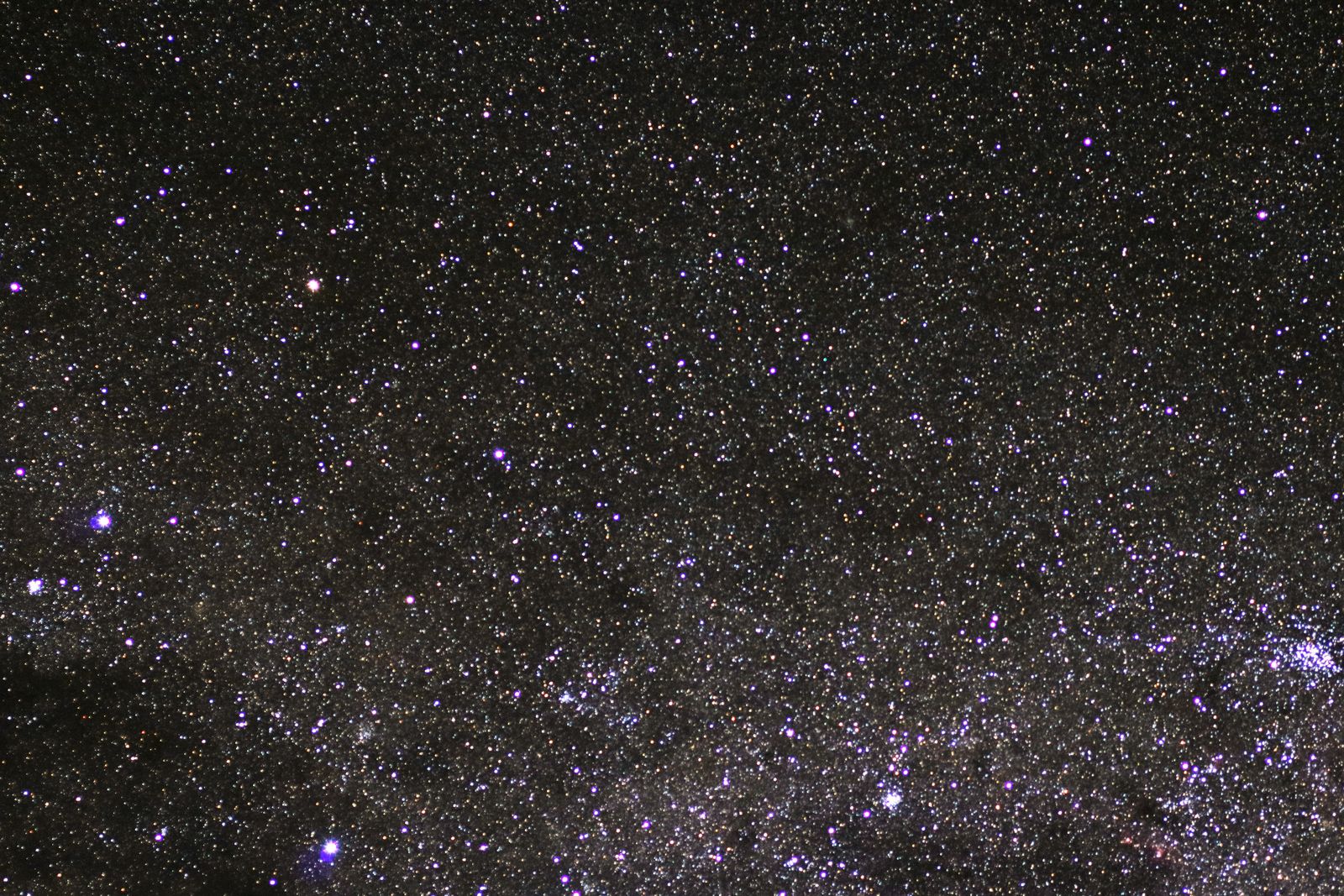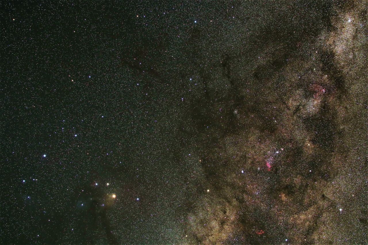 宮沢賢治の書いた「銀河鉄道の夜」でカムパネルラが消えたという石炭袋がこれで,濃い天の川の中にぽっかりと穴が開いたような感じの暗黒星雲です。写真でわかるように,よく見るとコールサック付近から後で書くηカリーナ星雲にかけてもずっと暗黒部が延びています。背景の天の川が明るい分だけこの暗黒部がきわだってハイコントラストで観察できるのです。