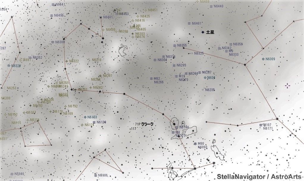 というわけですが,今日の2番目に取り上げた図は日本から見ることができる夏の南の空です。この星図によると,おおかみ座とじょうぎ座はさそり座の右側にあるのですが,地平線に近く,ほとんどわかりません。そしてまた,大きなさそり座の影にかくれてしまいます。