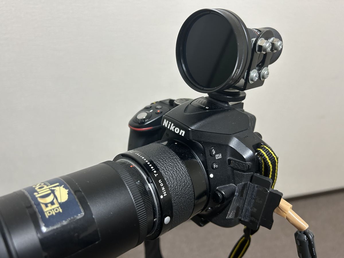問題は,太陽を望遠鏡の視野に入れるのがけっこう難しいということでした。肉眼であまり長く太陽を見るわけにもいきません。いろいろと試してみたのですが,結局思いついたのが,ビクセンの単眼鏡をファインダー代わりにすることでした。これをカメラのアクセサリーシューにつけて,単眼鏡のフィルターサイズが27ミリメートルだったので,27ミリメートルから52ミリメートルのフィルターが接続できるステップアップリングをつけ,そこにND100000のフィルターを接続しました。太陽を視野に入れるだけのわずかな時間ならこれで大丈夫です。