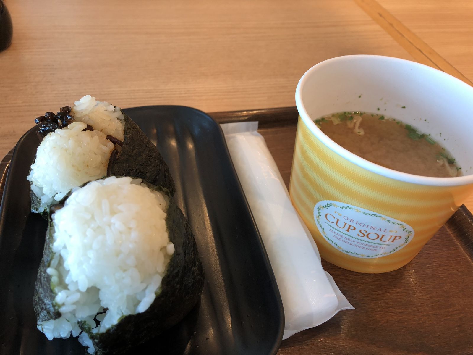 羽田空港の国内線ターミナルに到着した。セントレアまでの乗り継ぎ便の搭乗まで時間があったので,食事をすることにした。国内線ターミナルにはいろんな店があったが,私が選んだのは,おにぎりとお味噌汁であった。