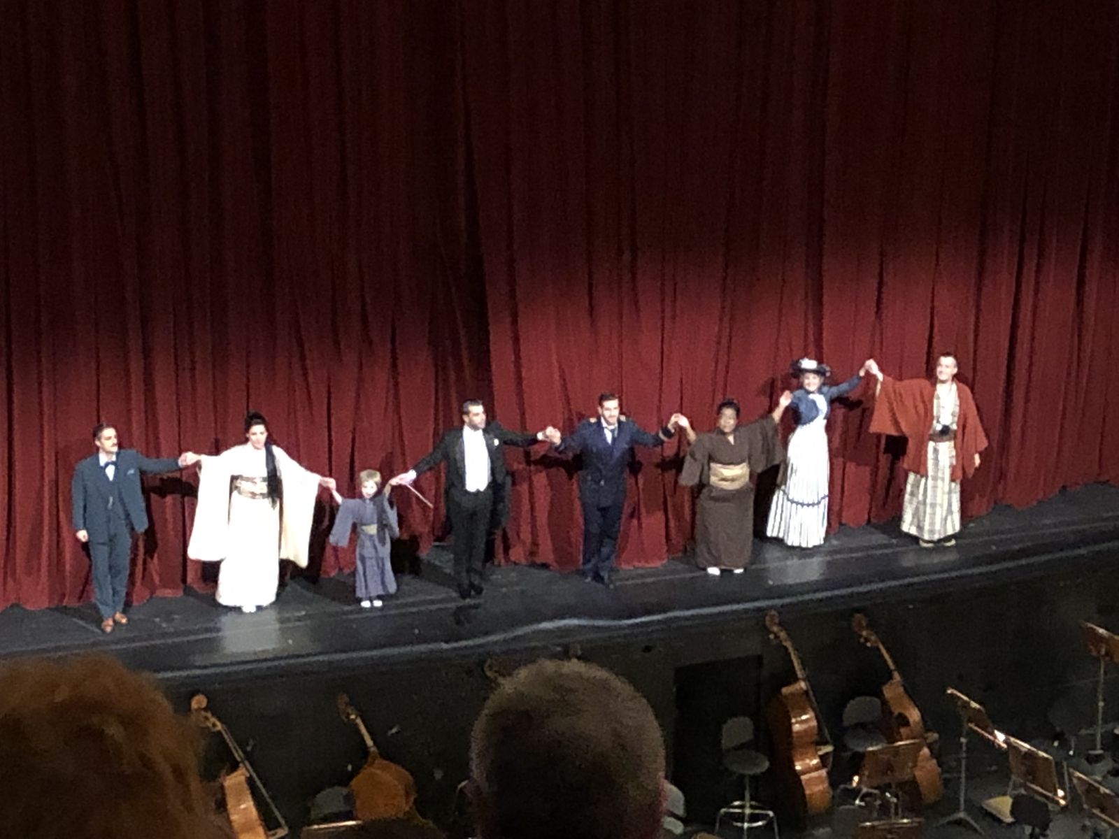 長崎を舞台に,没落藩士令嬢の蝶々さんとアメリカ海軍士官ピンカートンとの恋愛の悲劇を描いた単純なストーリーです。日本が舞台ということもあり,「宮さん宮さん」「さくらさくら」「お江戸日本橋」「君が代」「越後獅子」「かっぽれ」「推量節」,さらには「星条旗」などが引用されていて,特に日本人にはなじみやすい作品です。そうした曲と登場人物の心情や状況が巧みに描かれていてとてもおもしろいのですが,そういった曲になじみのない西洋人が聴いたときに,それをどのように解釈し感じるのか私には興味があります。また,ステージには西洋人が着物を着て出てくるのですが,昔の奇妙奇天烈な着付けとは違って,それほどの違和感はありませんでした。