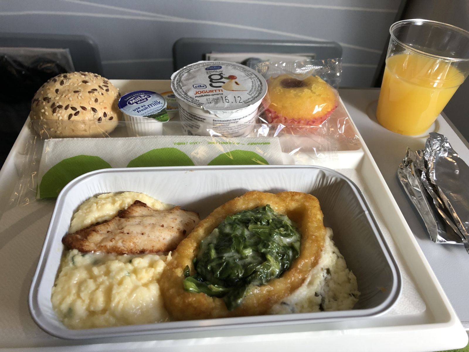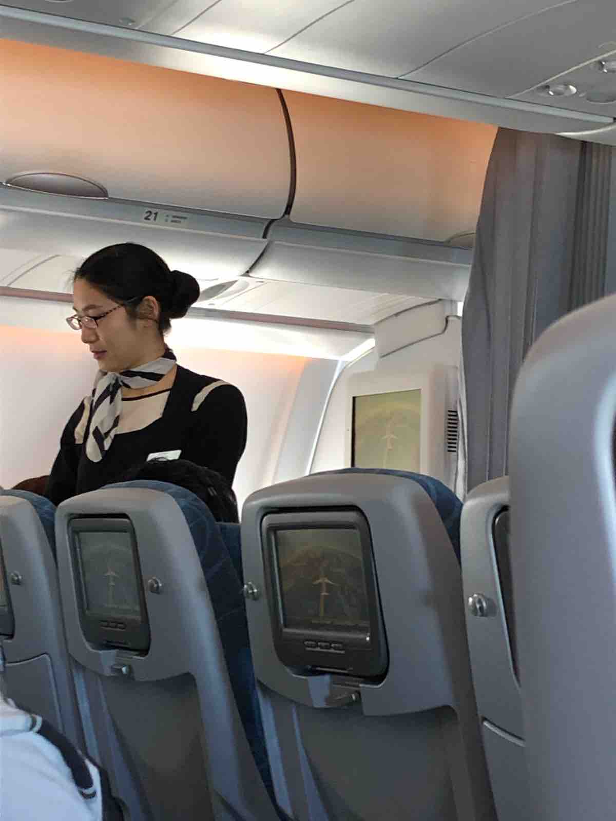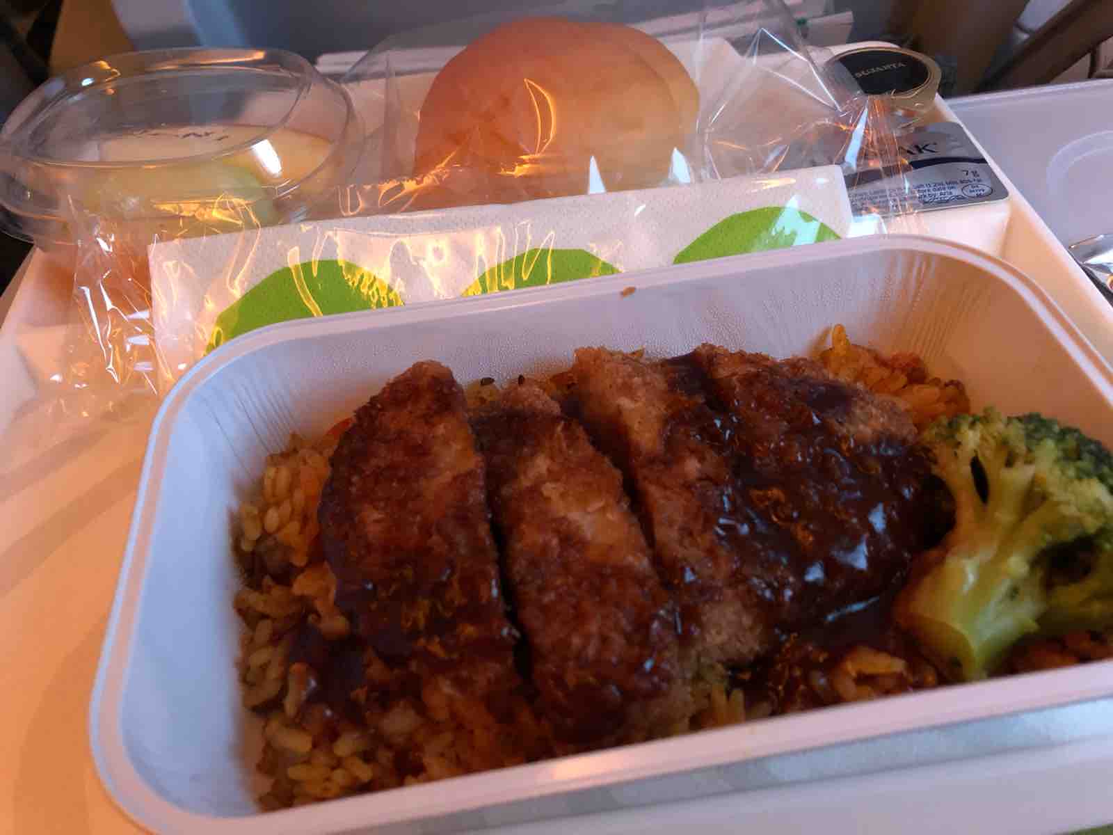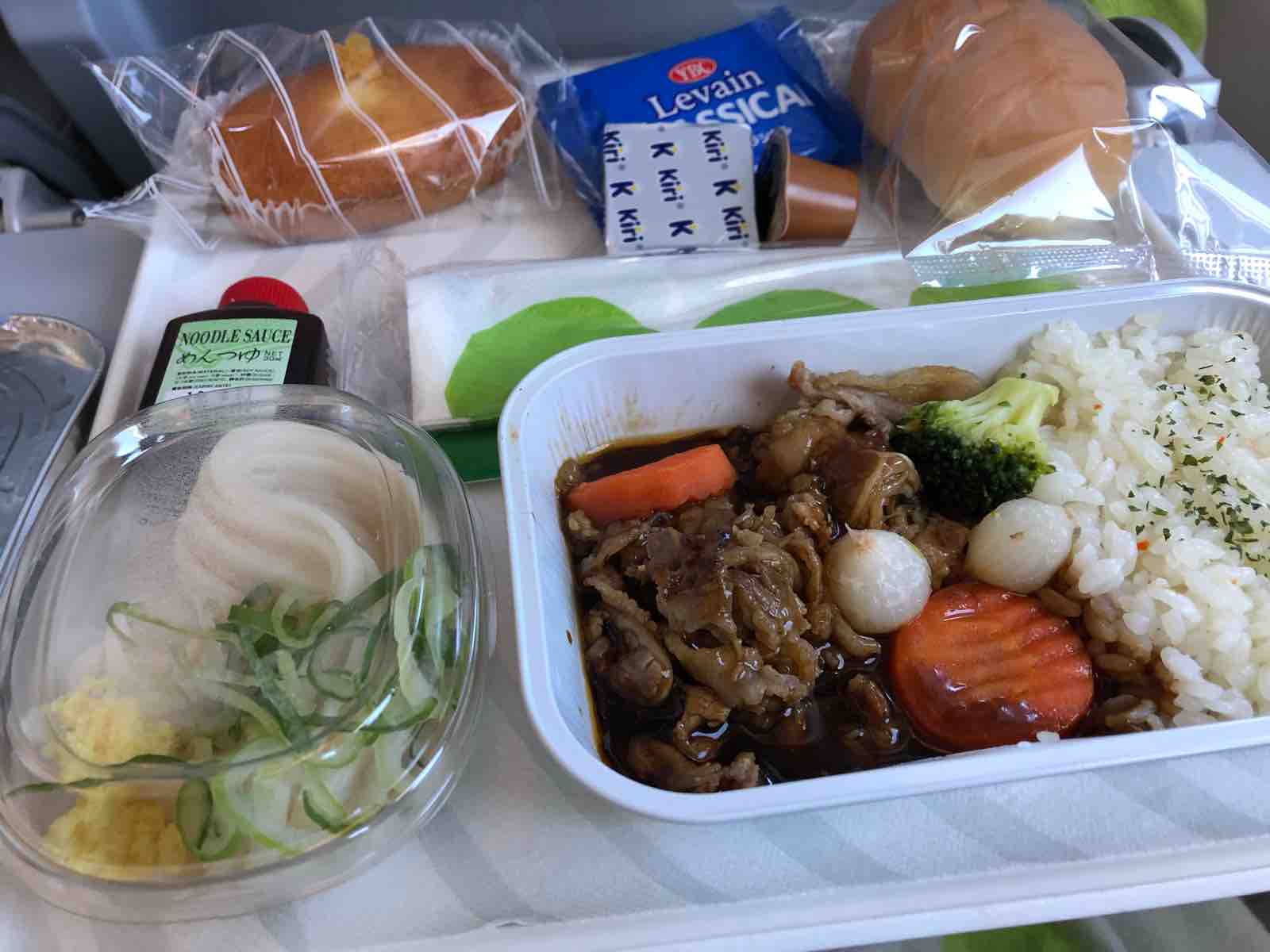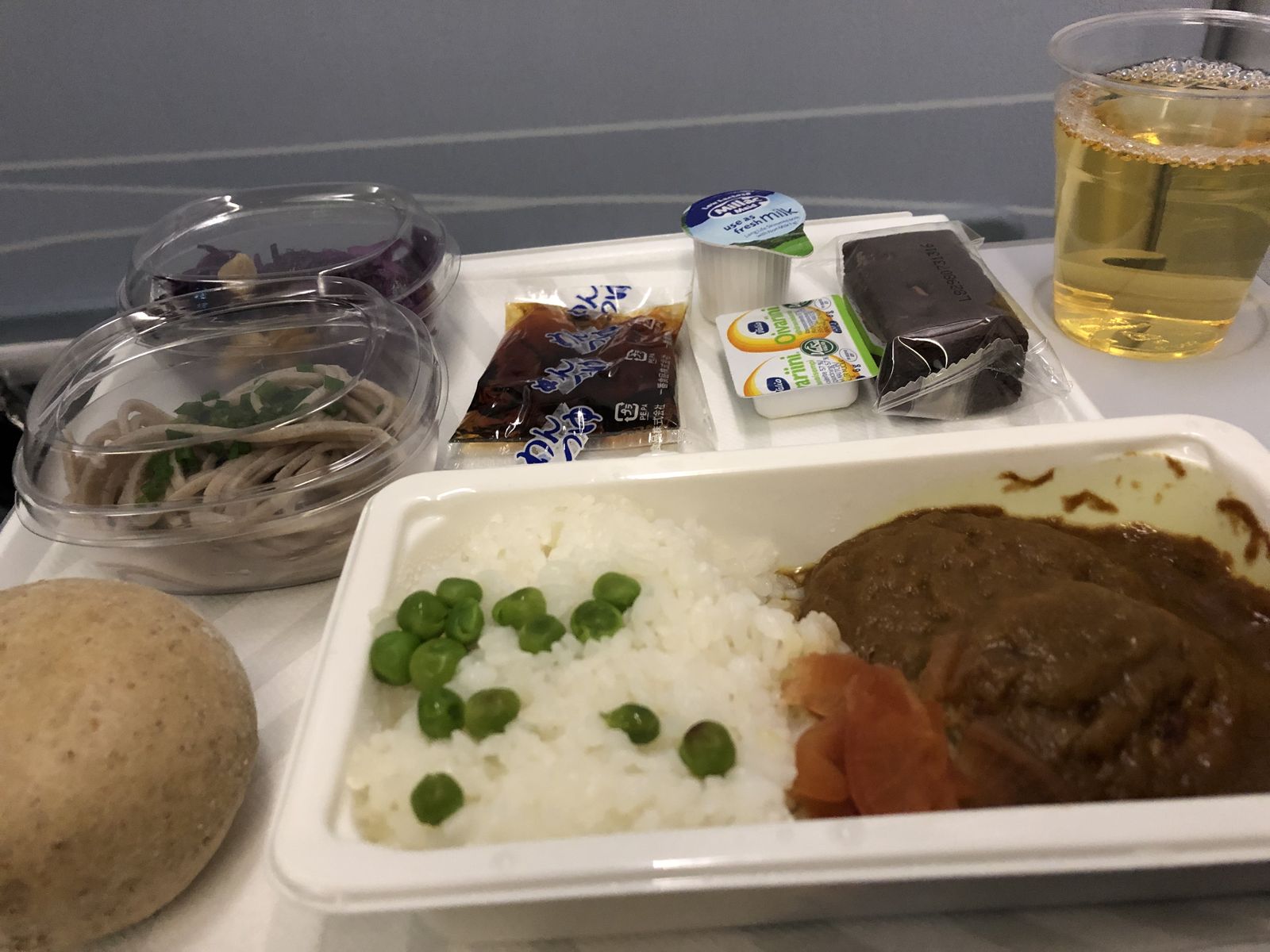 帰りもまた,エコノミーコンフォートにアップグレードしたので,まわりはガラガラ,私は今回もまた2席を独占できました。そんな快適な機内だったので,離陸後食事が終わったところですっかり寝入ってしまい,セントレア到着の1時間前に目が覚めたときにはすでに朝食のサービスは終わっていたようでした。しかし,私が起きたことに気づいたすてきな日本人客室乗務員に朝食をお持ちしますか? と尋ねられて,遅れて食べることができました。食事を終えたころには着陸態勢に入りました。