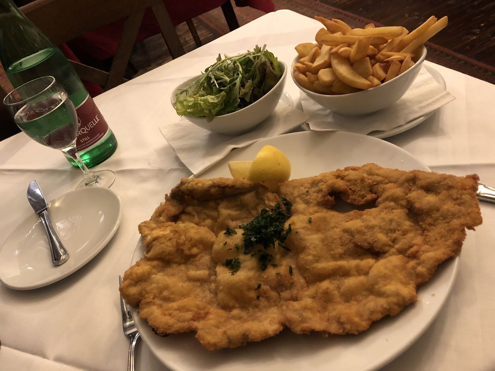 中に入るとウエイターがいたので「ひとりです」と言ったら席に案内してくれました。このレストランには日本語のメニューがあるそうなので,それを請求すると持ってきてくれました。これでどうやらずいぶんと観光客慣れしたレストランらしいことがわかりました。せっかくなのでウィーン名物,映画「サウンド・オブ・ミュージック」でも歌われたヴィナーシュニッツエル -これはラデツキー行進曲で有名なラデツキー将軍がミラノから持ち帰ったという子牛肉を使ったカツレツですが- を注文しました。ついでにサラダとポテトがつきました。ポテトはフレンチフライ(フライドポテト)とベイクドポテトなどが選べたらしいのですが,フライドポテトでいいでしょう,と言われたのでそのまま返事をしてしまったら,ものすごい量のフライドポテトが運ばれてきて後悔することになりました。