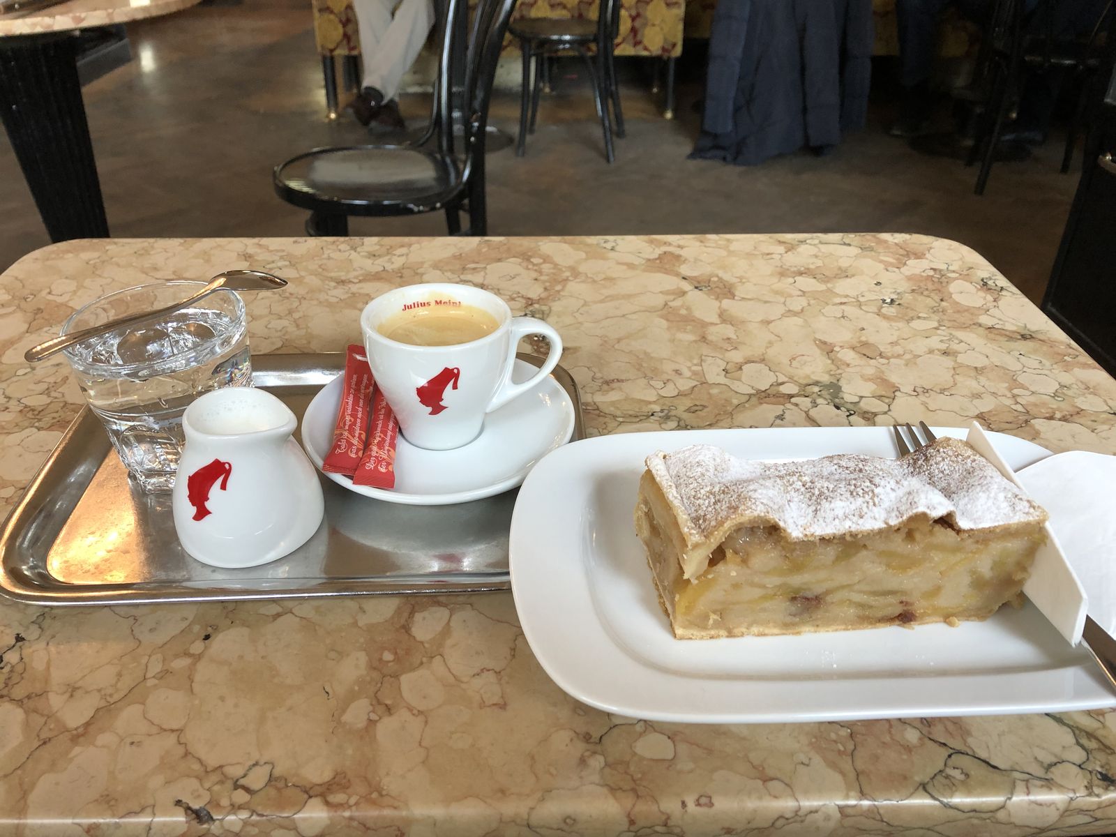 アルベルティーナ広場でツアーは解散になりました。ちょうどお昼だったので,この日は薦められた広場の横にあるカフェ・ティローラーホーフで昼食を済ませました。このお店は1920年代の伝統的なウィーンのカフェハウス様式が残り,大理石のテーブルでくつろぐ常連さんが多いということです。私はここで名物のアプフェルシュトゥルーデル(アップルパイ)とコーヒーを注文しました。