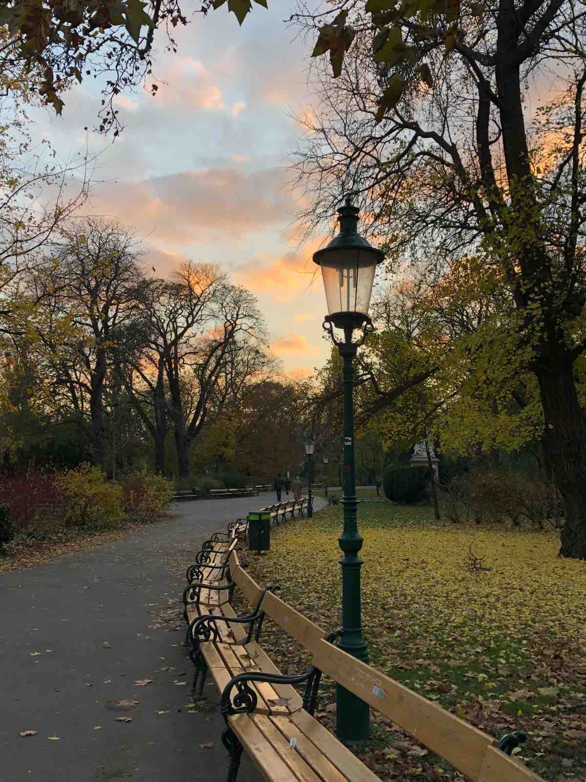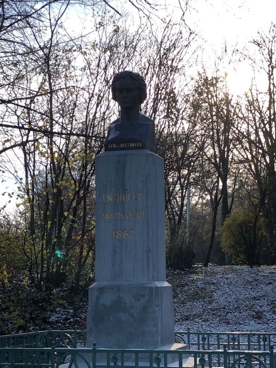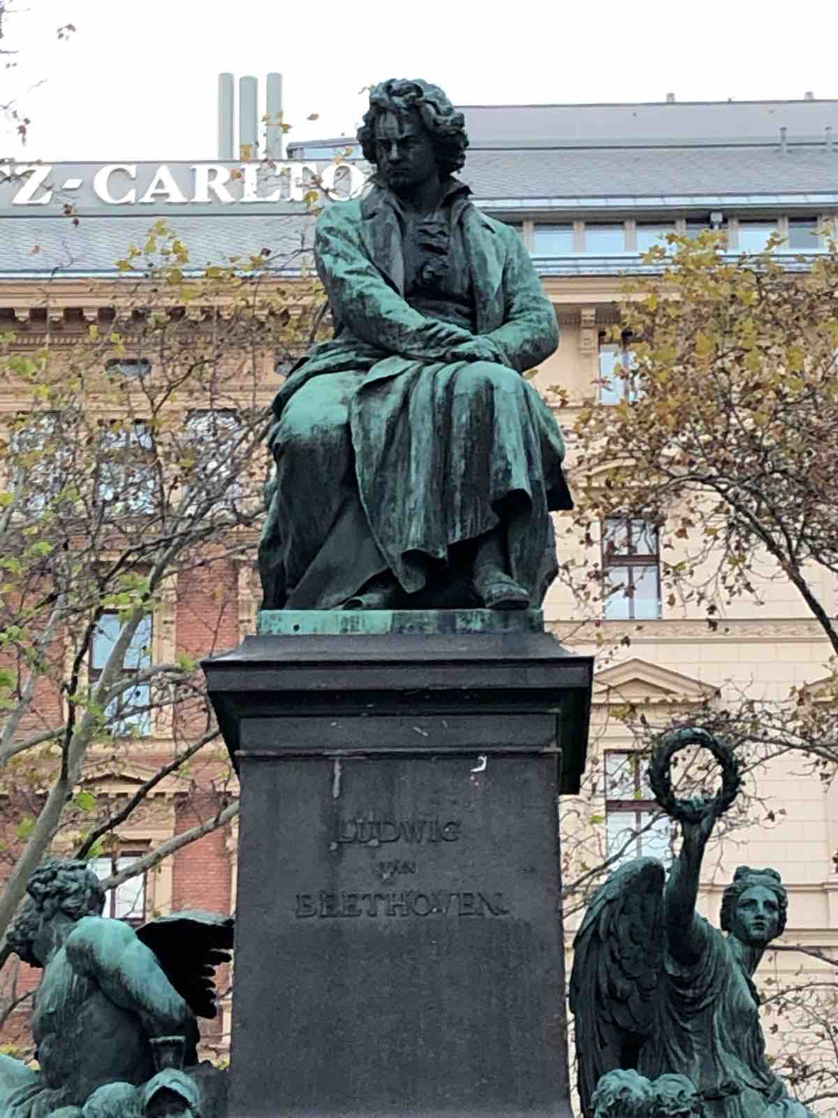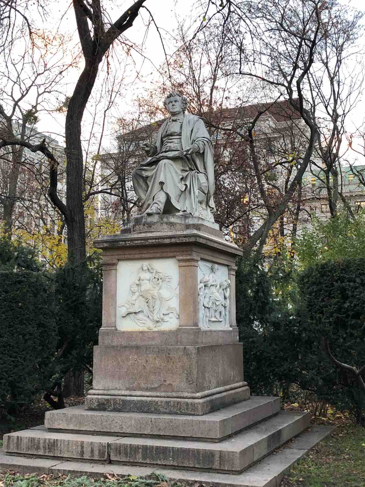 こうして多くの見どころを見た最後に,市立公園にある作曲家の銅像をさがすことにしました。市立公園は昨日ウィーンに着いた早々,地下鉄を降りてホテルまで歩いていったミッテ駅のある場所なのですが,昨日は暗く,また,不案内で通り過ぎただけでした。公園に着くとちょうど夕暮れで,紅葉した木々が美しく,すばらしい風景でした。この公園にはシューベルト,ブルックナー,ヨハン・シュトラウス,そして,ベートーヴェンの銅像がありました。