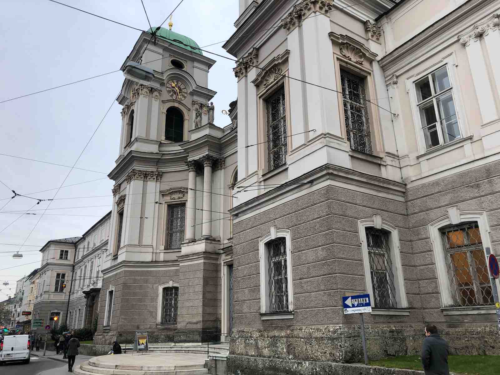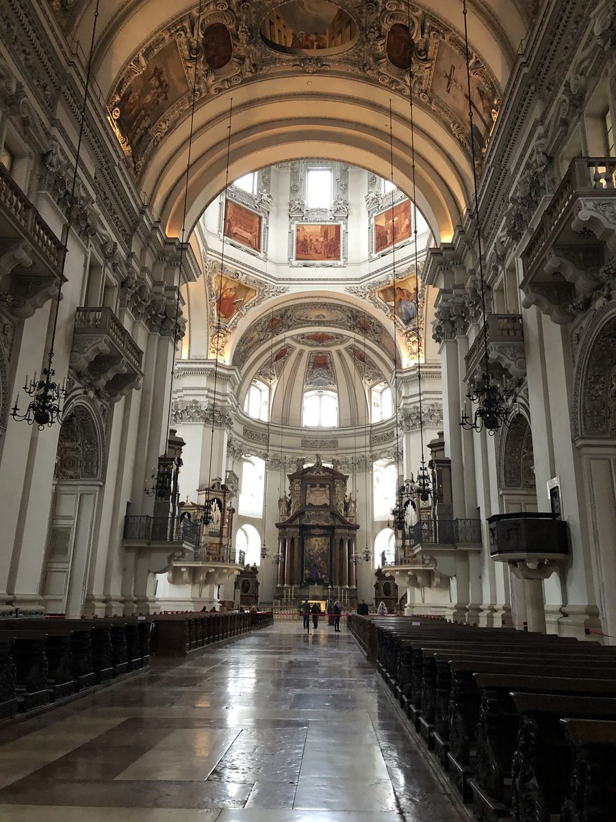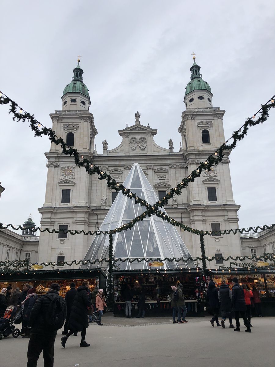 その隣にあったのが大聖堂でした。この巨大な身廊は長さが101メートルもあるそうで,巨大な丸天井からは光が降り注いでいるのが印象的でした。この大聖堂,モーツアルトが洗礼を受け,指揮者ヘルベルト・フォン・カラヤンの葬儀が行われた場所だそうです。 そんな荘厳な場所なのですが,教会前の広場はクリスマスマーケットで多くの人で賑わっていて,急に現実に引き戻されました。
