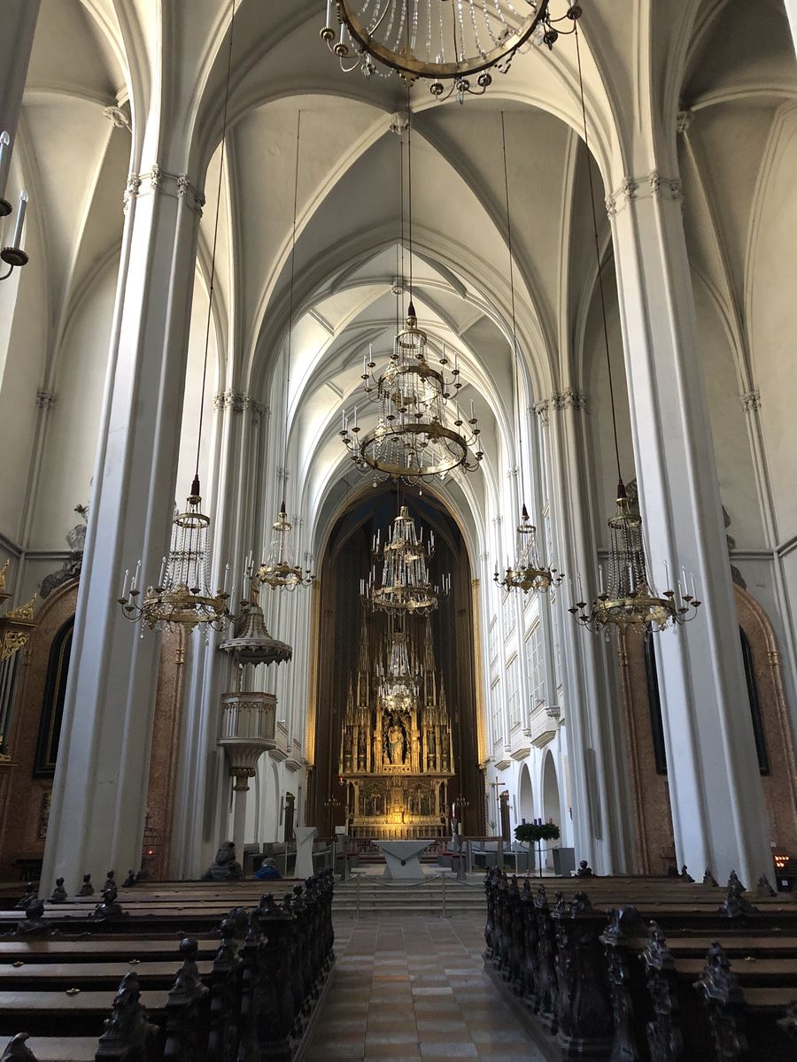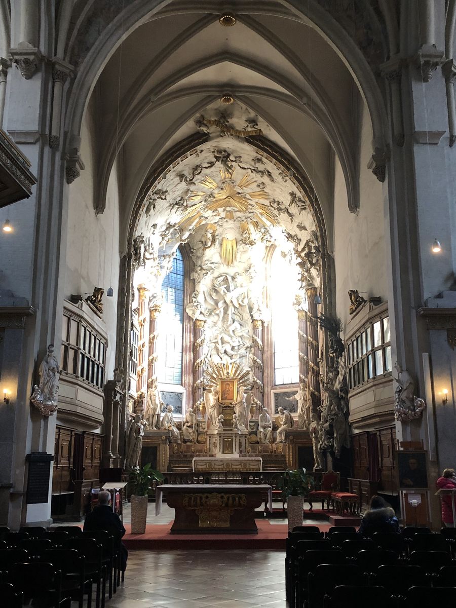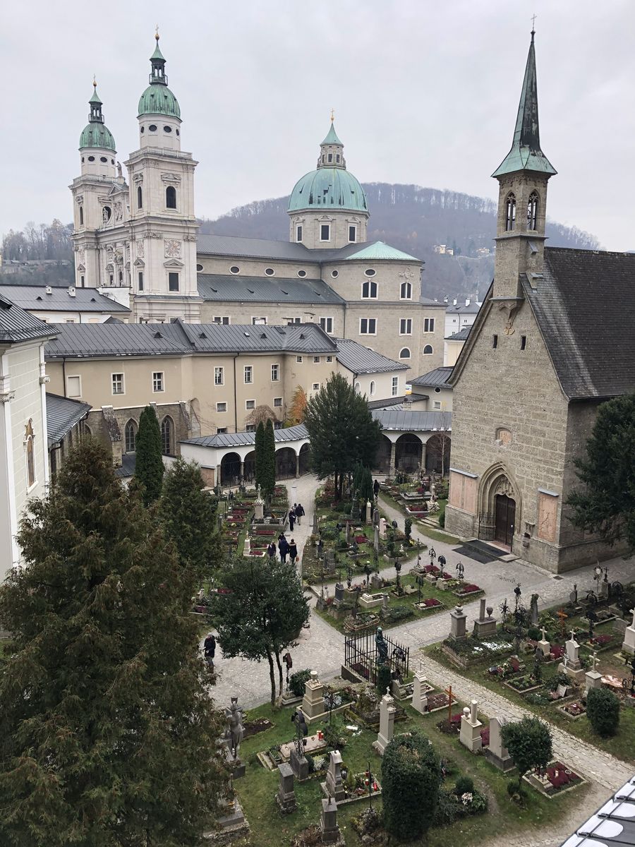 その隣にあったのが大聖堂でした。この巨大な身廊は長さが101メートルもあるそうで,巨大な丸天井からは光が降り注いでいるのが印象的でした。この大聖堂,モーツアルトが洗礼を受け,指揮者ヘルベルト・フォン・カラヤンの葬儀が行われた場所だそうです。 そんな荘厳な場所なのですが,教会前の広場はクリスマスマーケットで多くの人で賑わっていて,急に現実に引き戻されました。