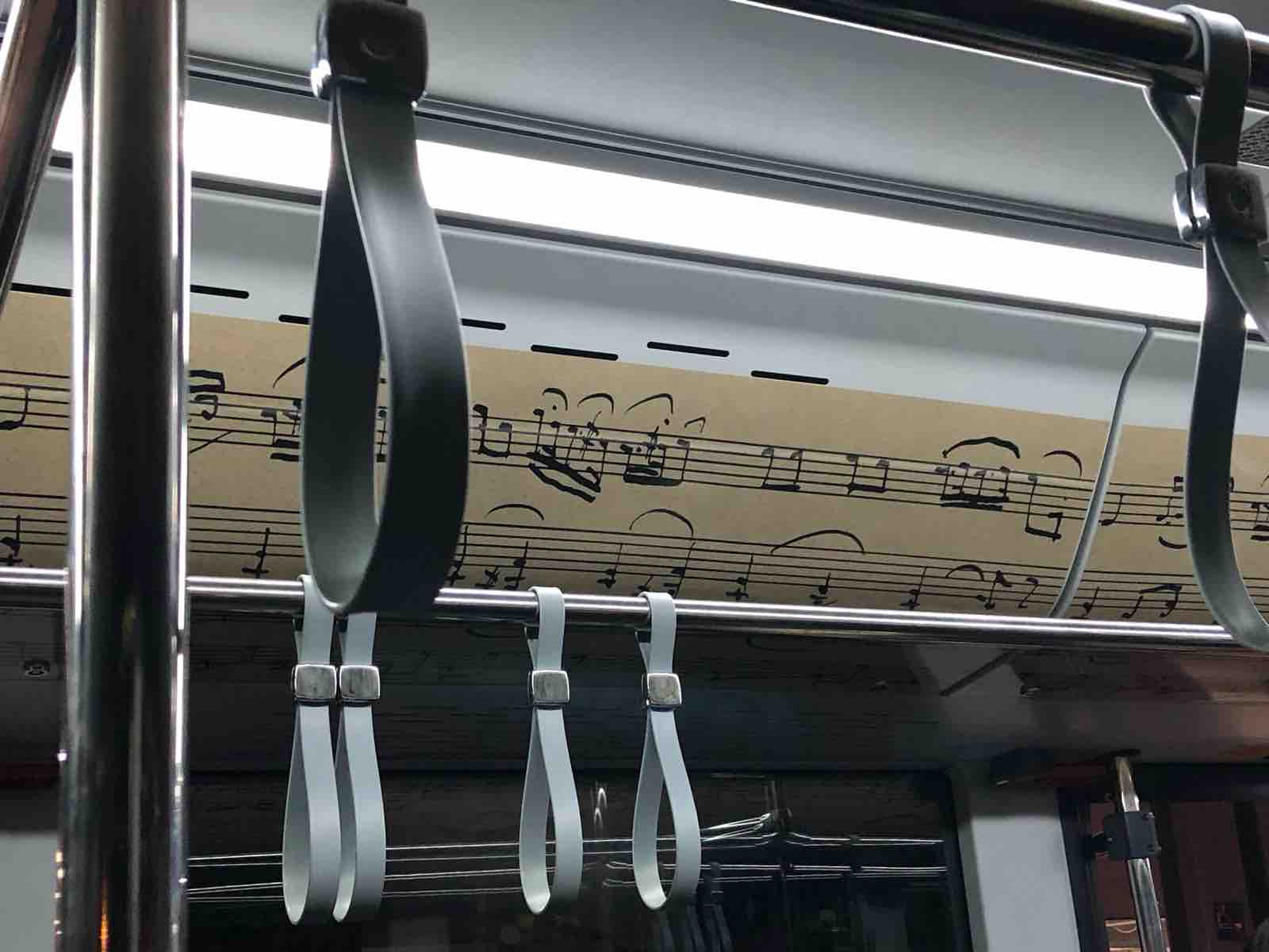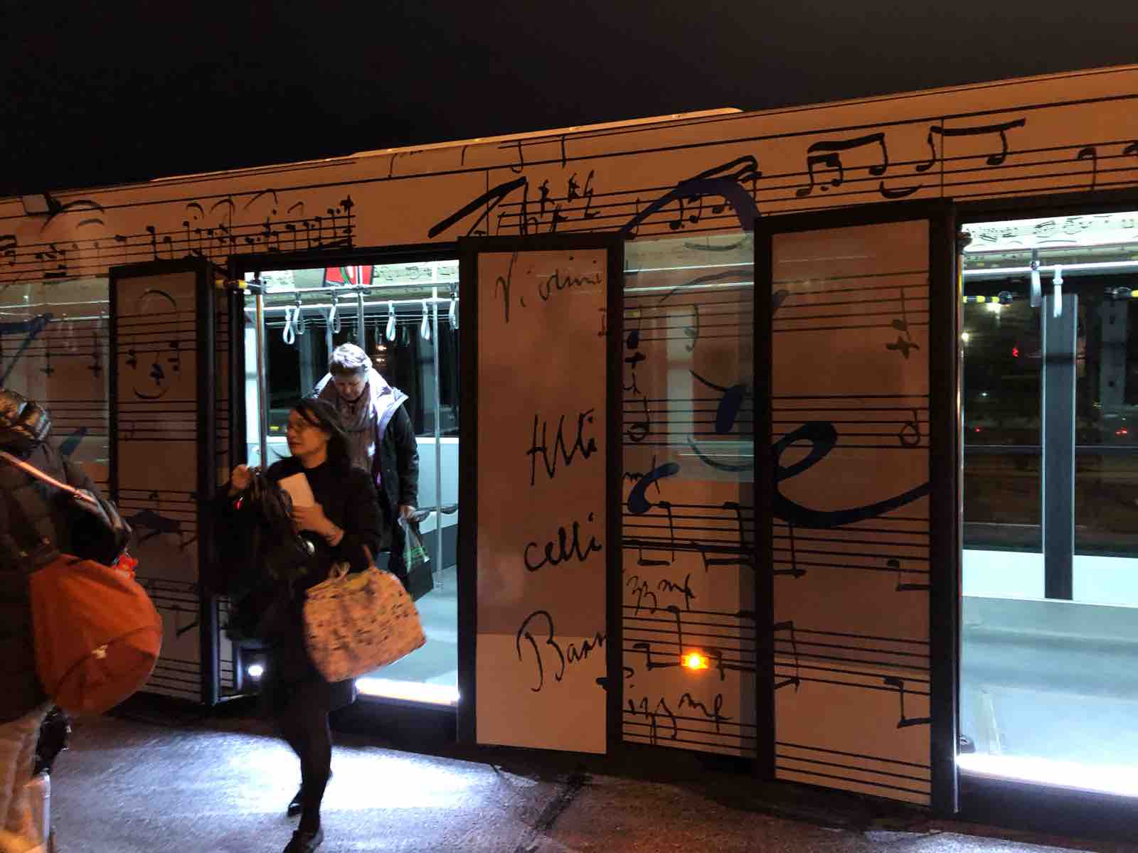 ヘルシンキからウィーンまでは2時間30分のフライトです。出発ゲートから旅客機まではバスでの移動でしたが,今回乗ったバスは,あの,前回見たボディ一面にシベリウスの曲が書かれた「シベリウスバス」でした。車内もまたシベリウスの曲で埋め尽くされていました。