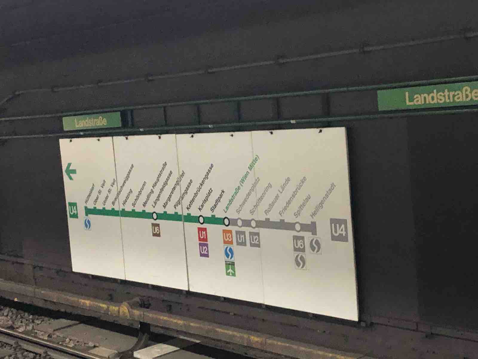 不安をよそに,まあなんとかなるわとそのままホームに降りて,止まっていた電車に乗りました。ここは始発駅なので,どの電車に乗ってもウィーン市内に行けるというのは予習どおりでした。車内では,隣にも私と同じチケットを持って心配そうに乗っていた人がいたので,これで同罪だと,なぜか安心しました。ガラガラの車内で約20分,ミッテ駅に着きました。今度はミッテ駅で地下鉄U4に乗り換えようと地下鉄のホームまで行って電車を待っていても,一向に電車が来ません。そのうちにスタッフの制服らしきものを着た女性が近づいてきて、今日はこの路線の私の行く方向は運行していない(運行が終了した)というではないですか。私の混乱はさらに拍車をよび,しかし,どうにもならないので,ミッテ駅からホテルまでは1キロメートル,大した距離でもないので歩くことにしました。