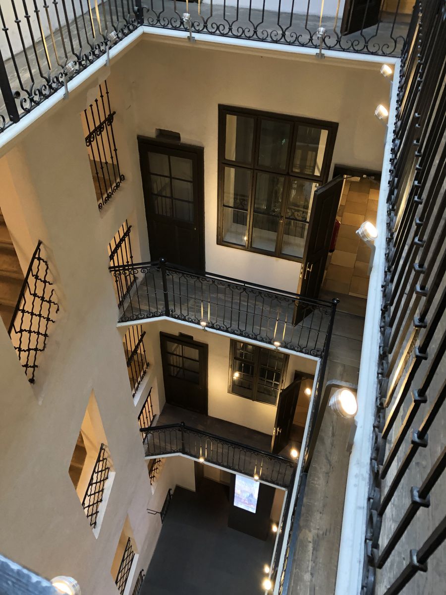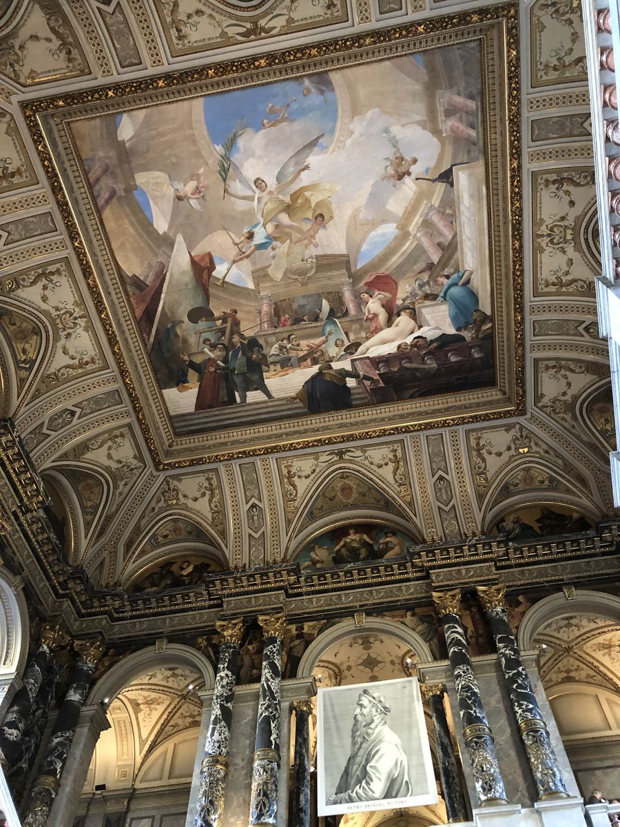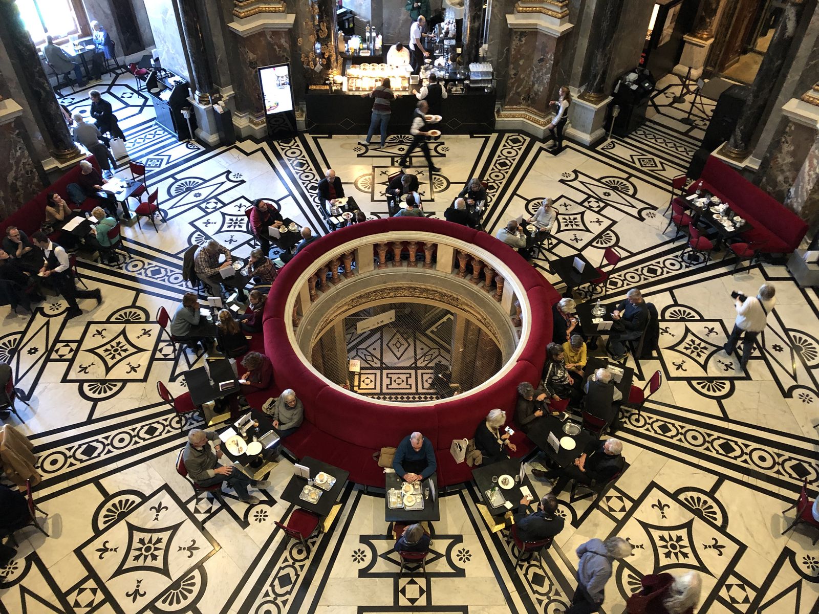 この時点でお昼になりました。私ははじめこの美術史博物館内の2階にある洒落たカフェで昼食を,と思っていました。しかし,だれも考えることは同じらしく並んでいたので断念して,3階からカフェの写真をとりました。