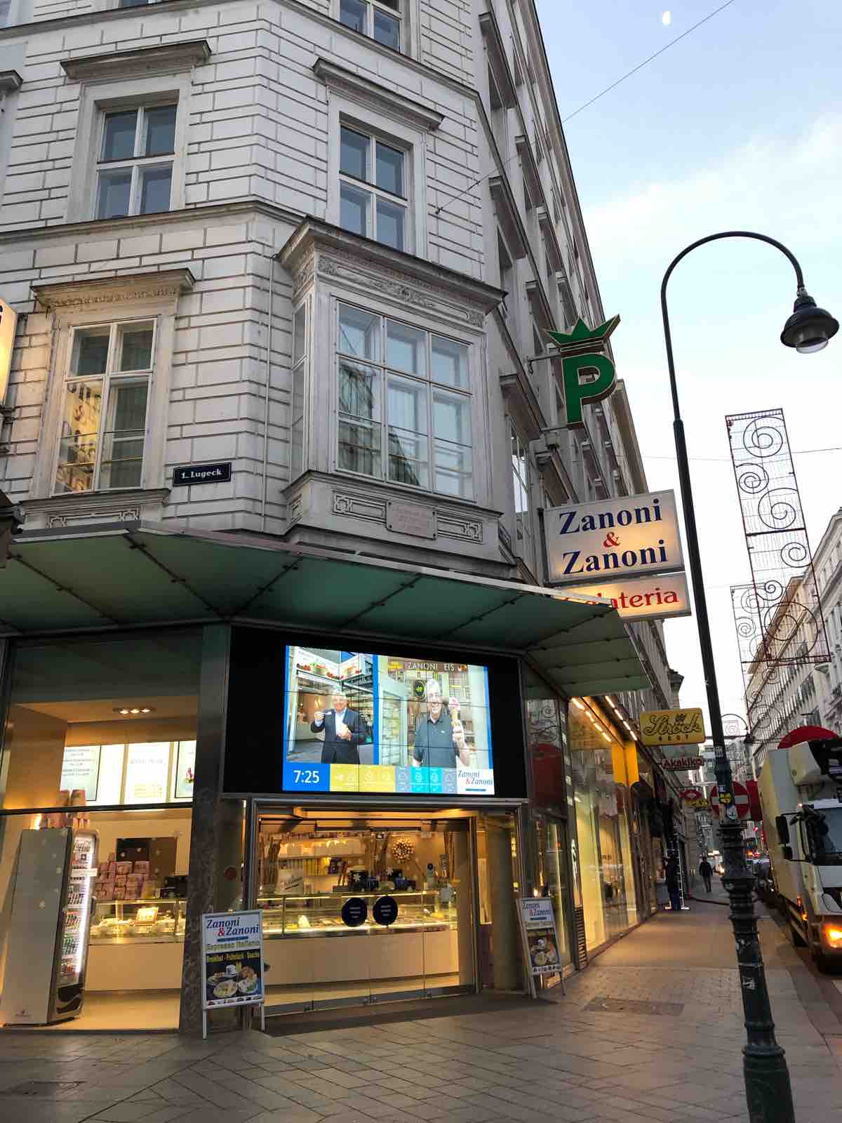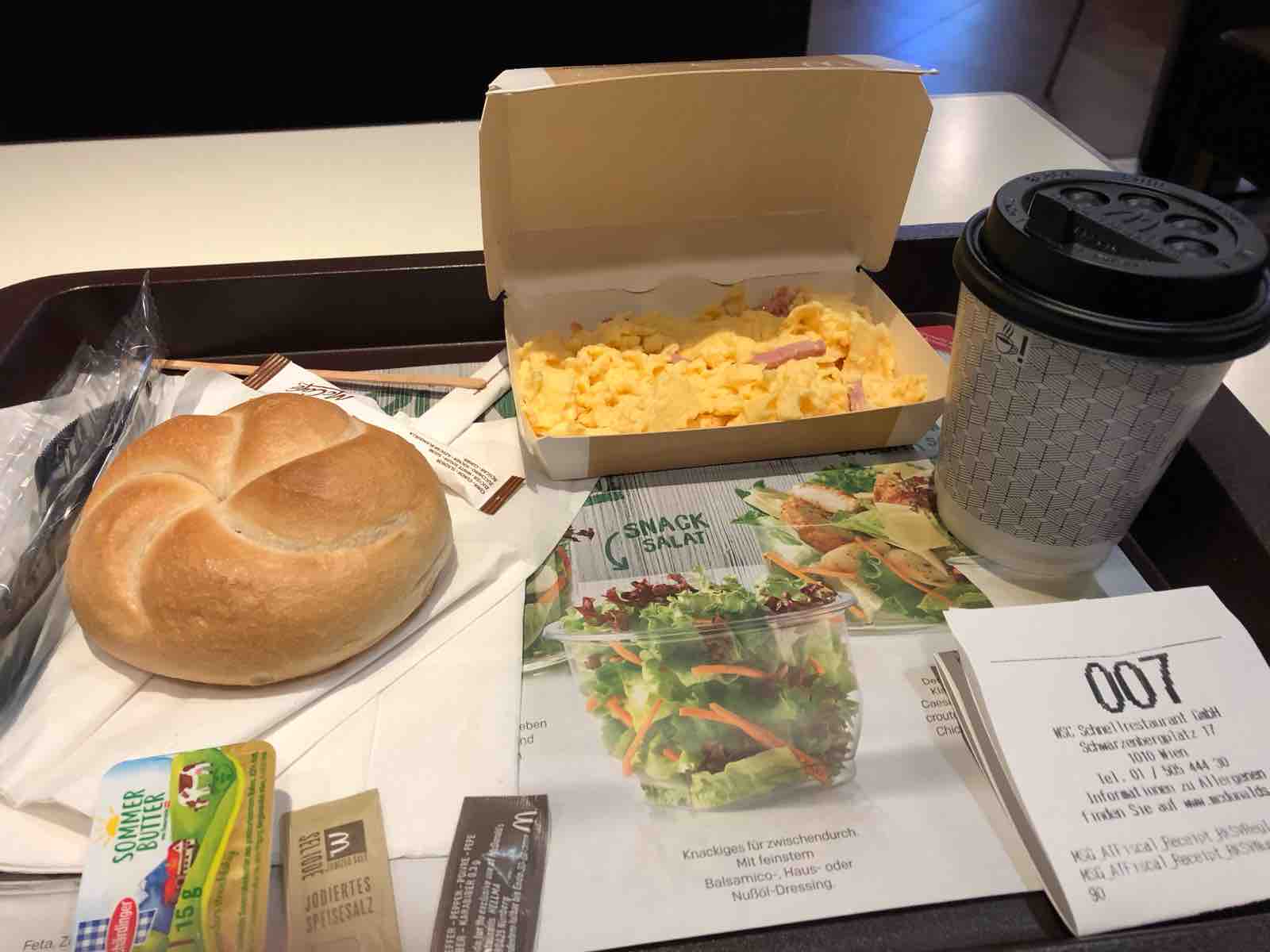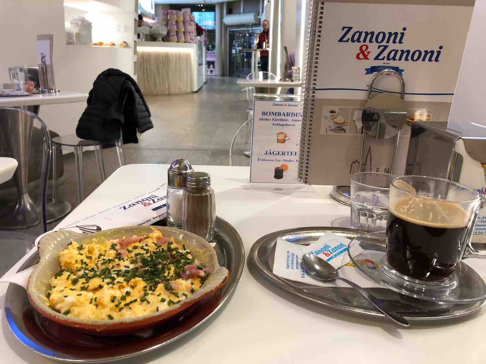 簡単な朝食をとるつもりが,ケルントナー通りでちよっと粋なカフェを見つけたので,思い切って中に入りました。そこで様々な朝食メニューがあったので,私はスクランブルエッグとコーヒーの朝食をとりました。
