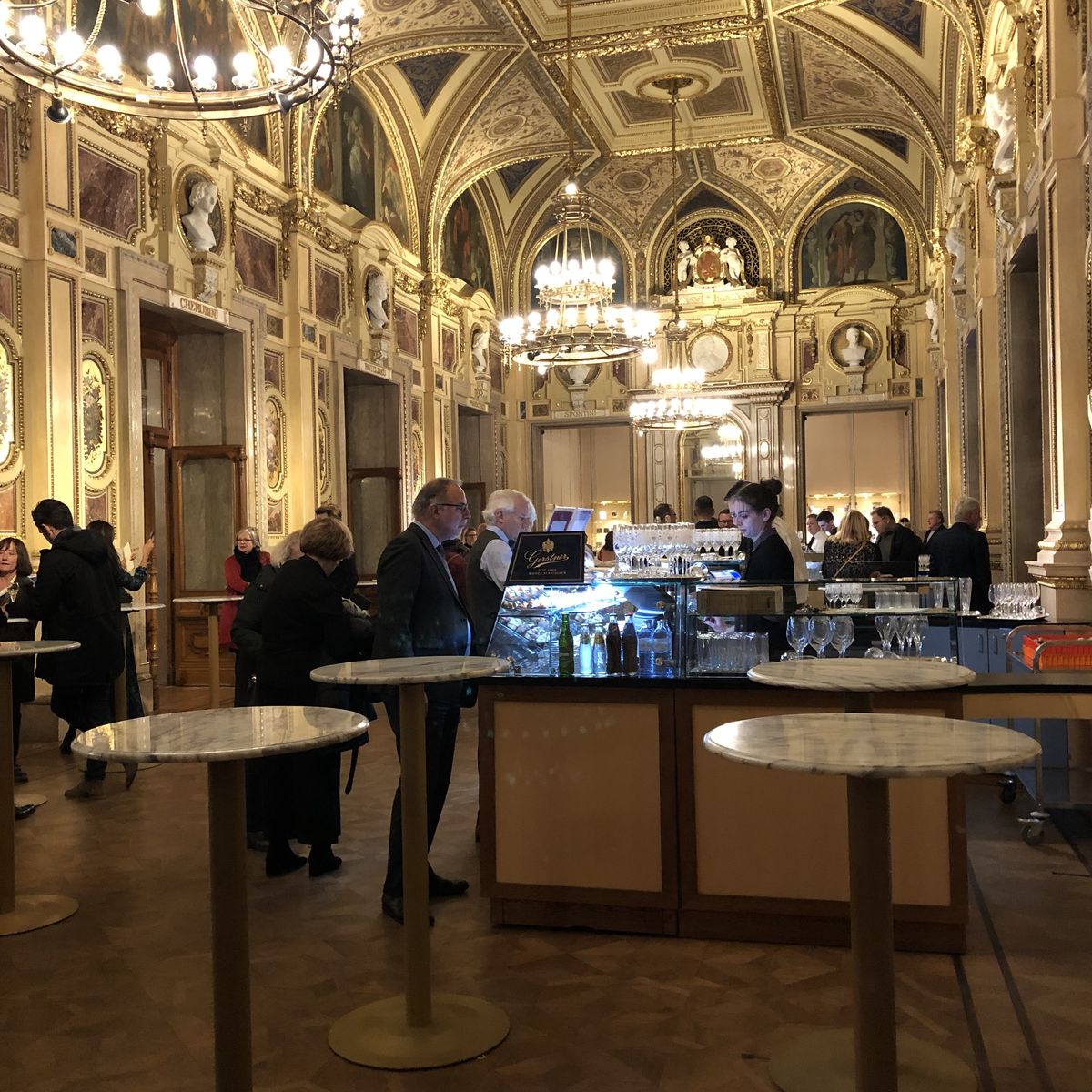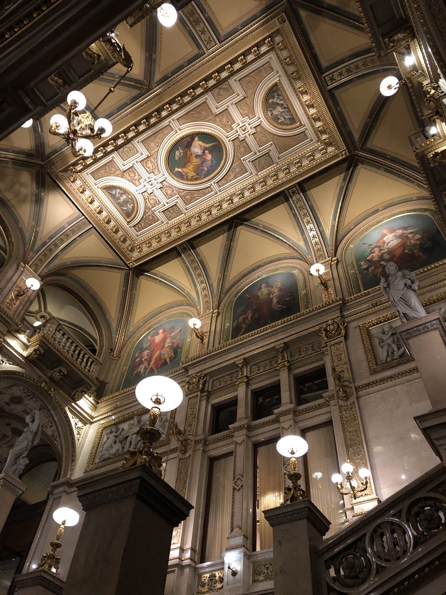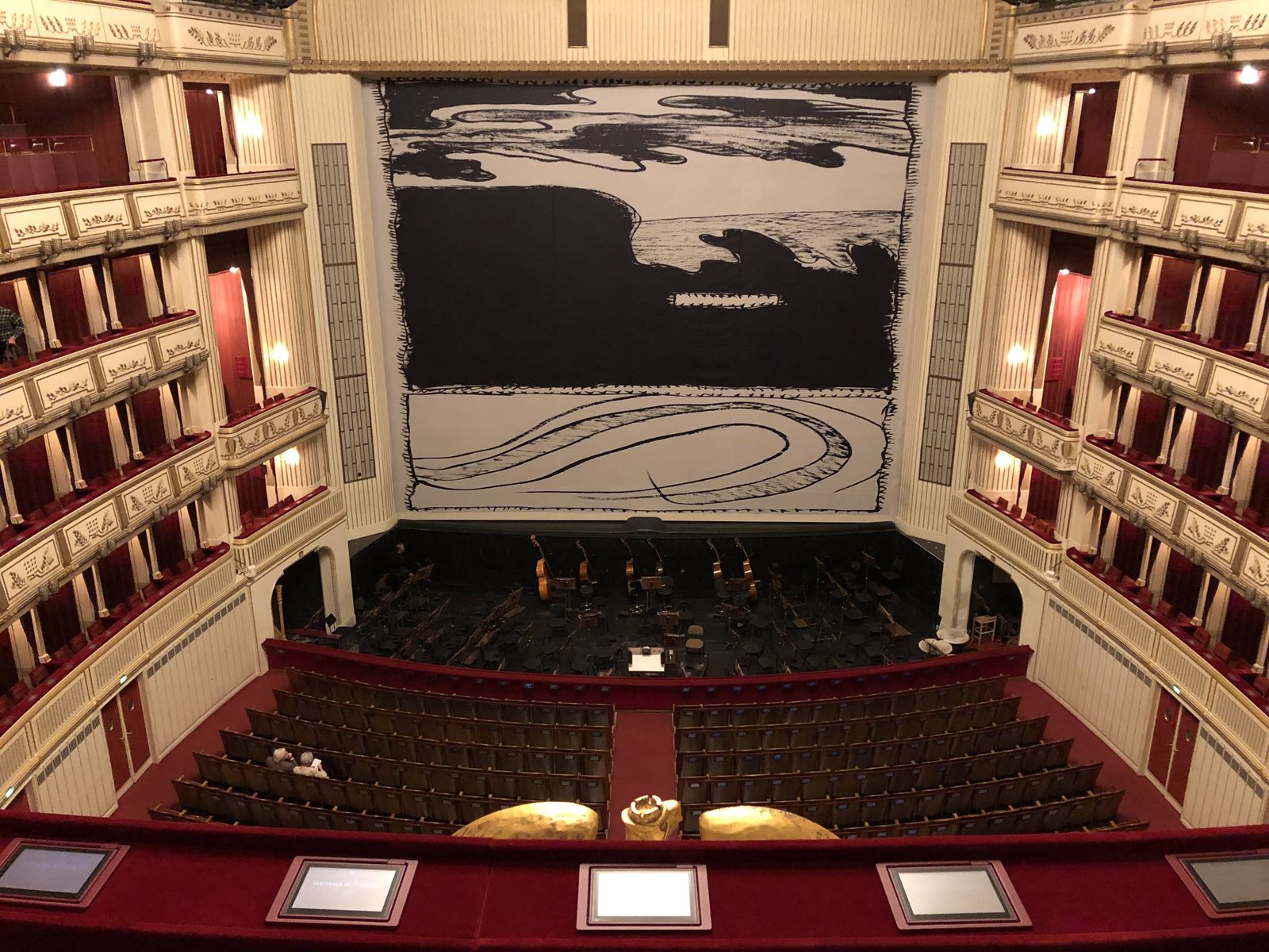 国立歌劇場(シュタッツオパー=Staatsoper)は伝統的な建物ですが,それぞれの座席の前面にはハイテクなディスプレイがあって,休憩時間の食事の注文ができたりもします。また開演中はそこに各国語の字幕が出ます。その一方で,客席には着飾った紳士・淑女,さらには大きく胸の開いたドレスを着た女性がいたりして,まさに伝統的な社交会の雰囲気でした。