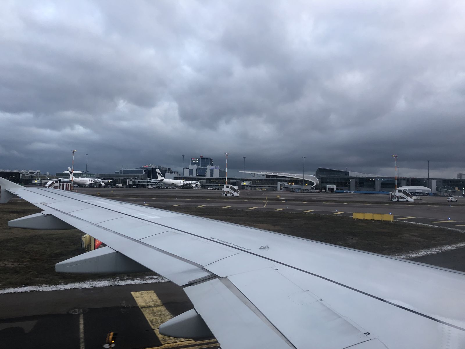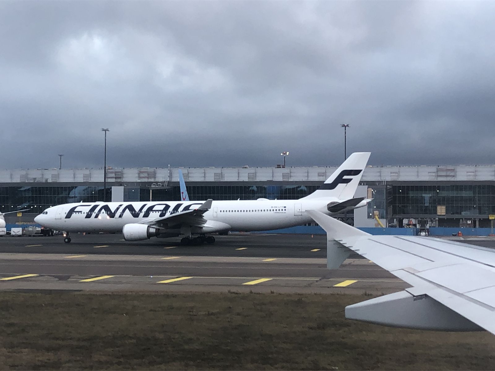 機内のディスプレイに表示されている運行経路図はメルカトル図法なので,シベリア上空の距離が実際よりもかなり長くなっていて,しかも,日本からロシアに向かうあたりは図法の性質上長く描かれるので時間の割に進んでいないように感じるのですが,ロシア上空になると今度は逆に短く描かれていて,あっという間にフィンランドに到着です。