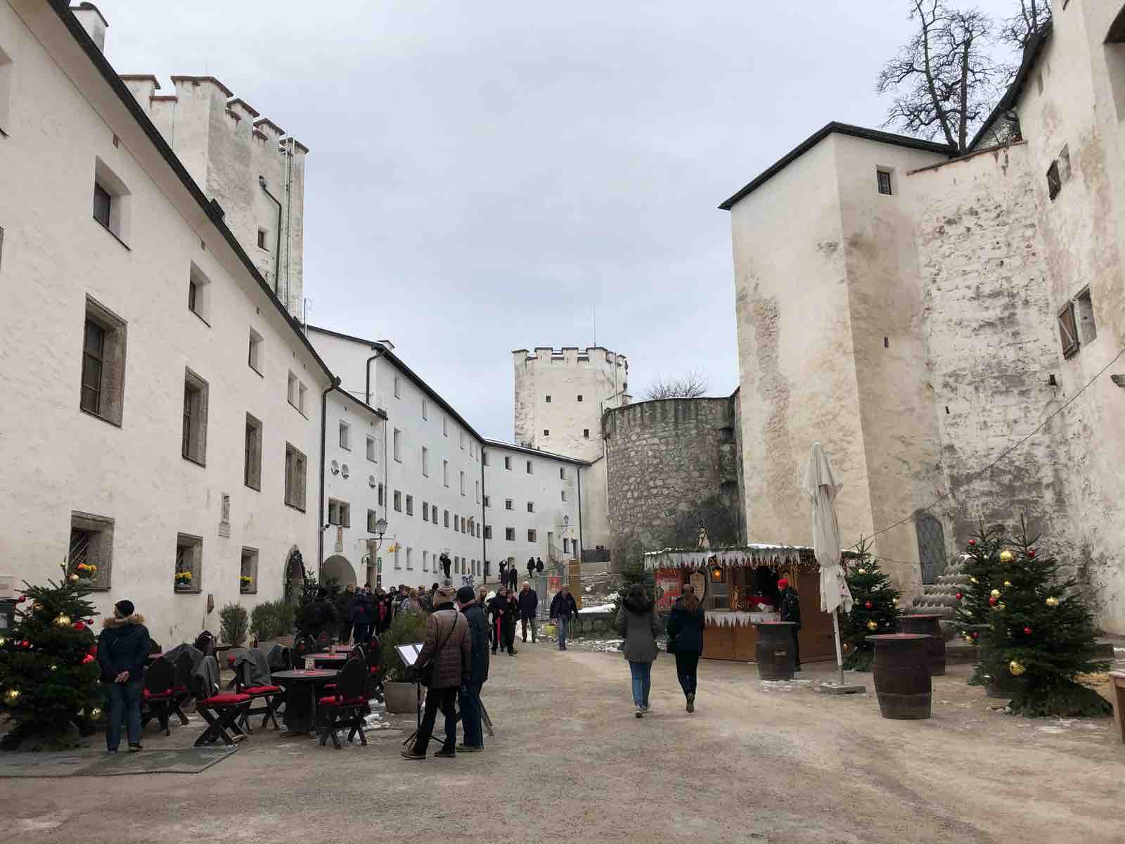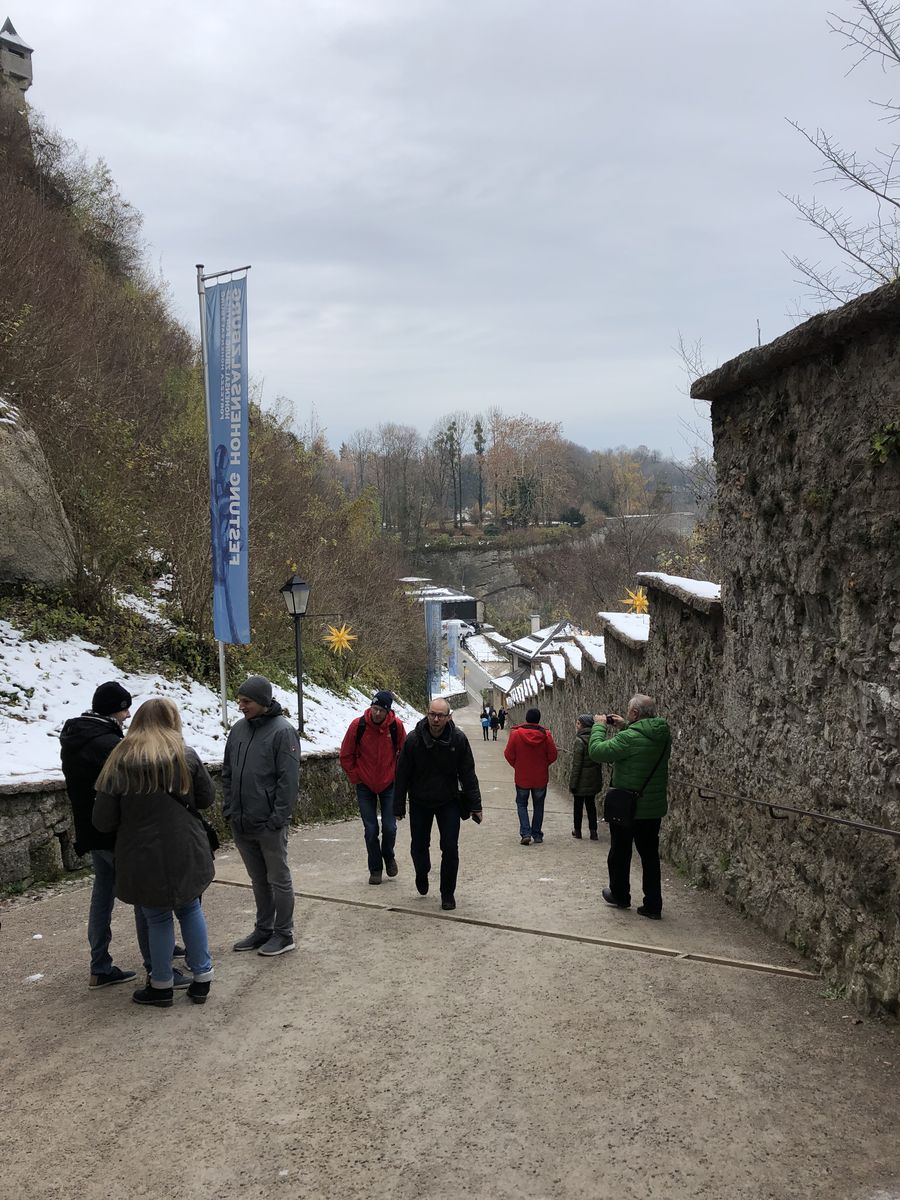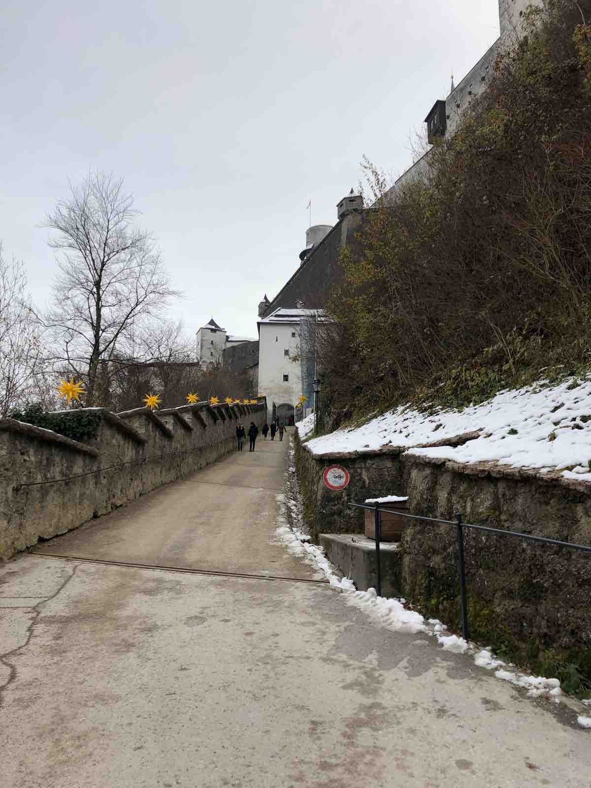 ホーエンザルツブルグ城塞はかなりの高さがあって,そんな場所に登れるなどとは思っていなかったのですが,見上げると,城塞には多くの人がいるではないですか。一体どうやって登るのだろうかと思ったら,ケーブルカーがありました。しかし,この日,ケーブルカーは運休していて,実は,その先にあった入口から歩いて登っているのでした。ここまで来て登らないという選択肢はありません。寒さの中,汗でびっしょりになりながら,私もともかく登頂しました。城塞の上にもクリスマスマーケットがあったり,展望台からはザルツブルグの町が一望できて,苦労して登った甲斐があったと思ったことでした。