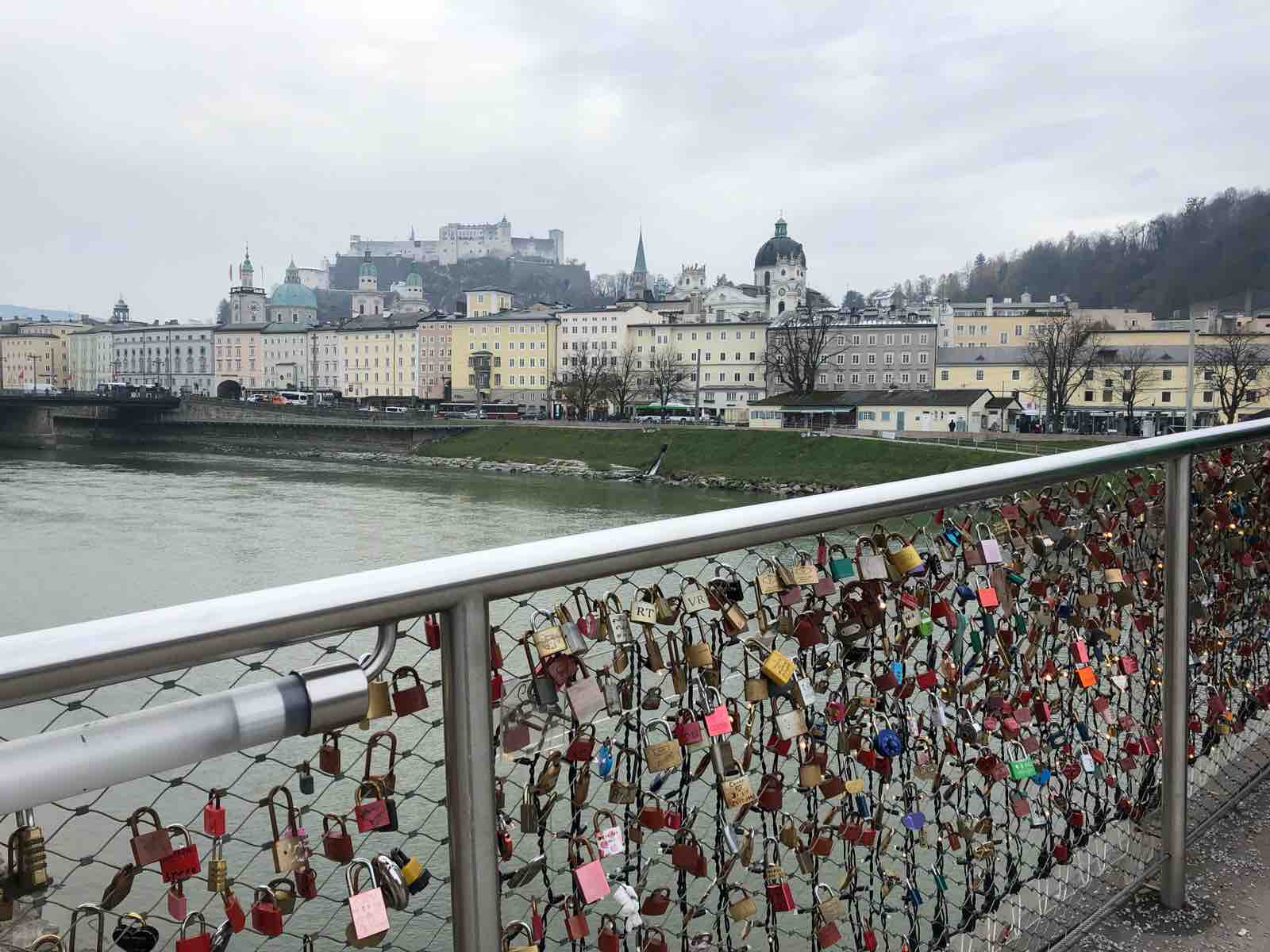 モーツアルトの住居の道の向こうにあったのが三位一体教会で,そこからザルツァッハ川に向かって歩き,マカルト橋を渡ると,いよいよザルツブルグの旧市街に入ります。だれがはじめたか,マカルト橋には恋人たちが幸せを祈って鍵をかけることが流行っているらしく,カラフルな南京錠で彩られていました。旧市街に入ったところに船着き場があって,ザルツブルグカードで遊覧船に乗れるということでしたが,残念ながらこの日は遊覧船はお休みでした。また,このあたりに指揮者ヘルベルト・カラヤンの生家があるということですが,わかりませんでした。