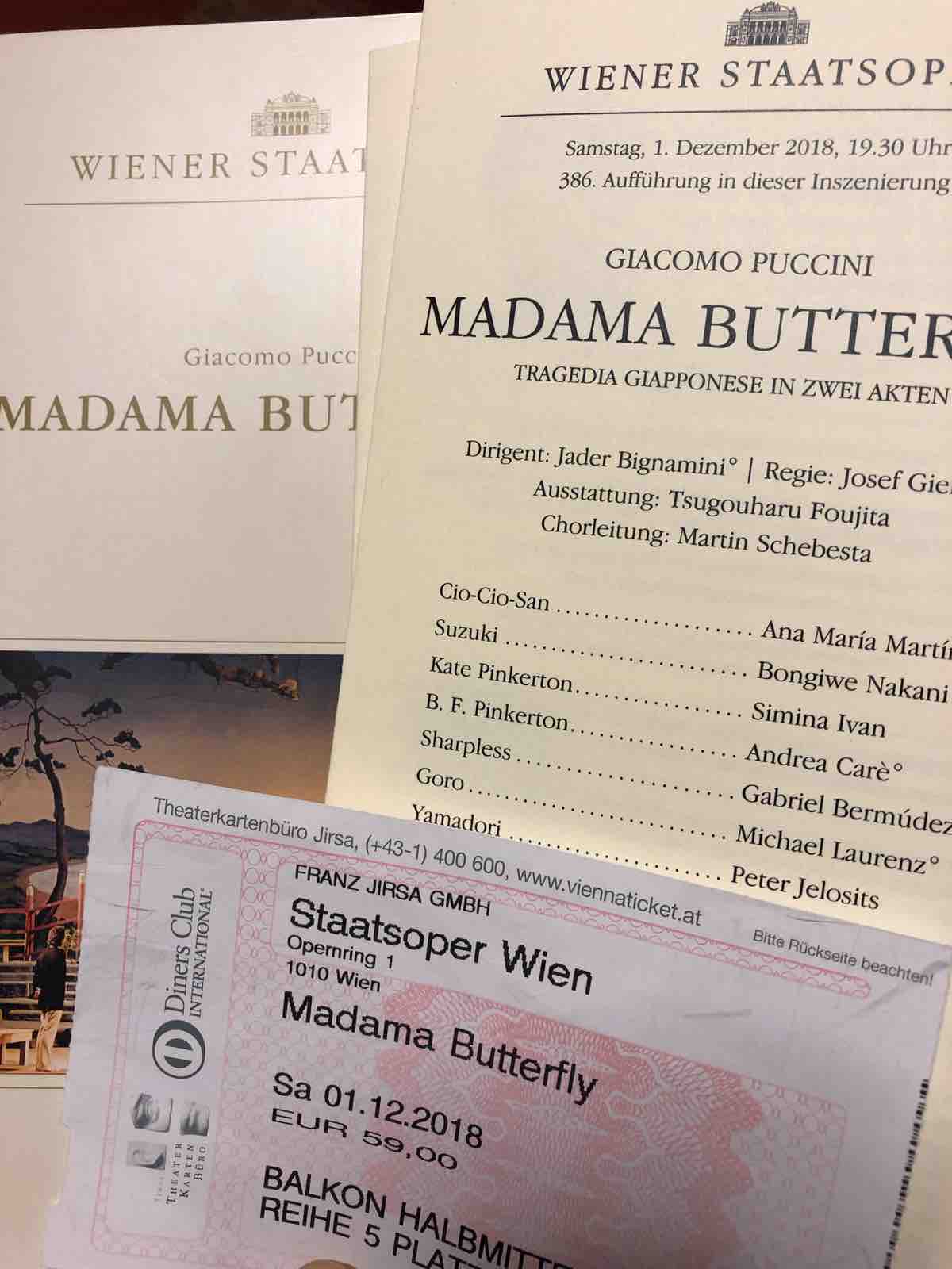 今回ウィーンに行くにあたって,私がぜひ行ってみたかったのは楽友協会でのコンサートと国立歌劇場でのオペラ鑑賞でした。そして,楽友協会でのコンサートは3日目に実現し,いよいよこの5日目の晩はオペラ鑑賞,まさに旅のハイライトでした。この日はプッチーニの「蝶々夫人」,わかりやすさにかけて最高の演目です。