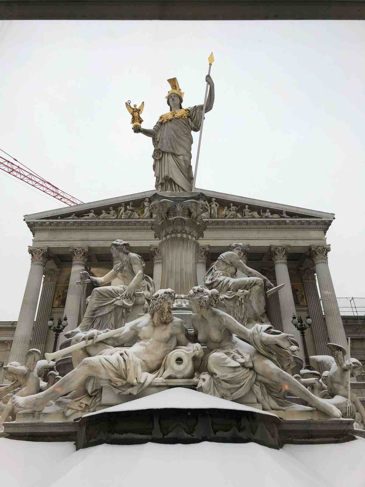 その後は目的地のベルヴェデーレ宮殿とナッシュマルクトに行くために,市庁舎,国会議事堂の前を歩いて過ぎました。国会議事堂は2020年まで改修工事中で,仮の建物が見学できると「地球の歩き方」には書いてありますが,実は,改修工事中の工事現場にプレハブ作りの建物があって,その中に入ると大きな窓から国会議事堂の前にある女神ニケの像を右手に持つアテナ女神像を見ることができるのです。ほとんどの人はそのことを知らず,通り過ぎていきました。