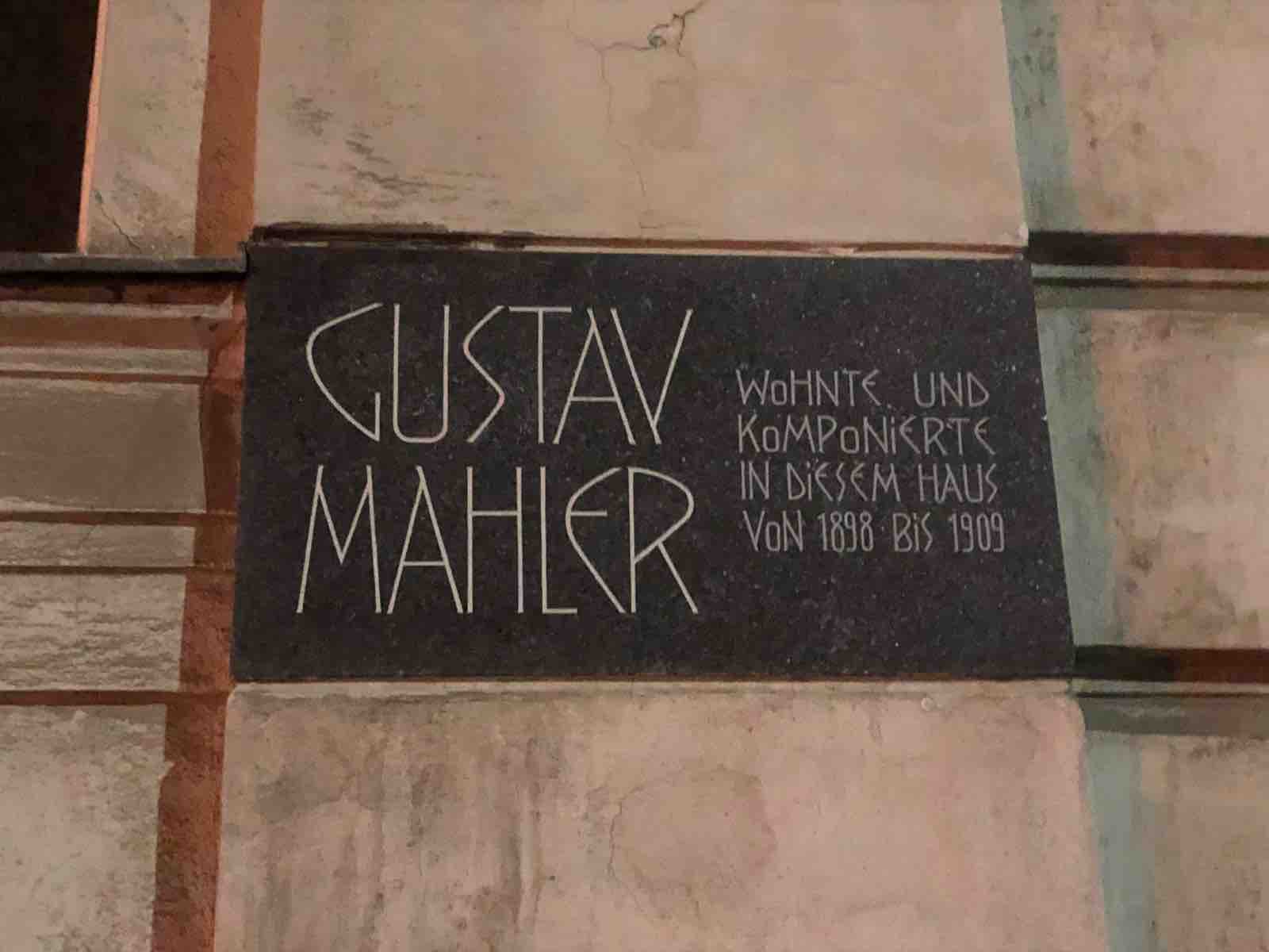 早朝にホテルを出て,街を散策して,ツアーの集合時間前に朝食をとることにしました。まず,私の宿泊しているホテルから南に少し行ったところにマーラーの住んでいた場所があるということだったので,歩いて行ってみました。すぐに建物が見つかって,建物の壁にはそこにマーラーが住んでいたというプレートを見つけました。このあとは,昨日見つからなかった作曲家の住居跡を示すプレート探しです。