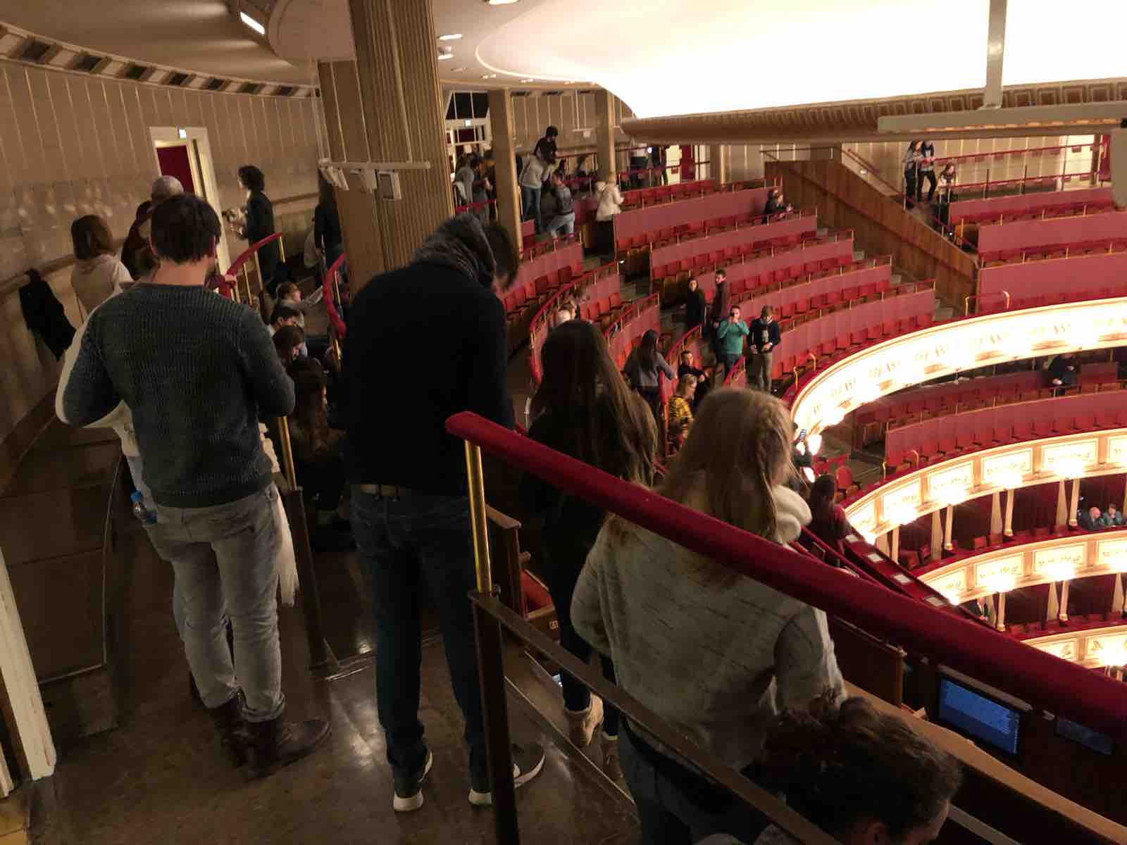 1階席の奥と馬蹄形になった4階の観客席の端と5階席中央の奥に非常に安価な立見席があります。そこだけは普段着の観光客や子供が押し掛けてすし詰め状態になっていて,まるで満員電車の車内のような異空間で,オペラを楽しむには程遠い状況でした。要するに,日頃オペラなんて聴いたこともなく興味もないおのぼりさん観光客が物珍しさで押し寄せているだけのことだろうと思っていたら,やはり,はじまって数十分もしたら,そうそうに引き上げていく人が続出し,第2幕になるころにはほどんど人がいなくなりました。