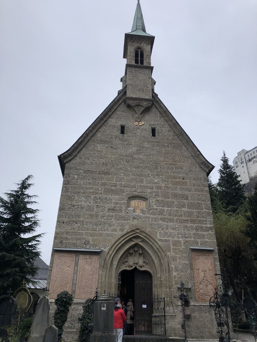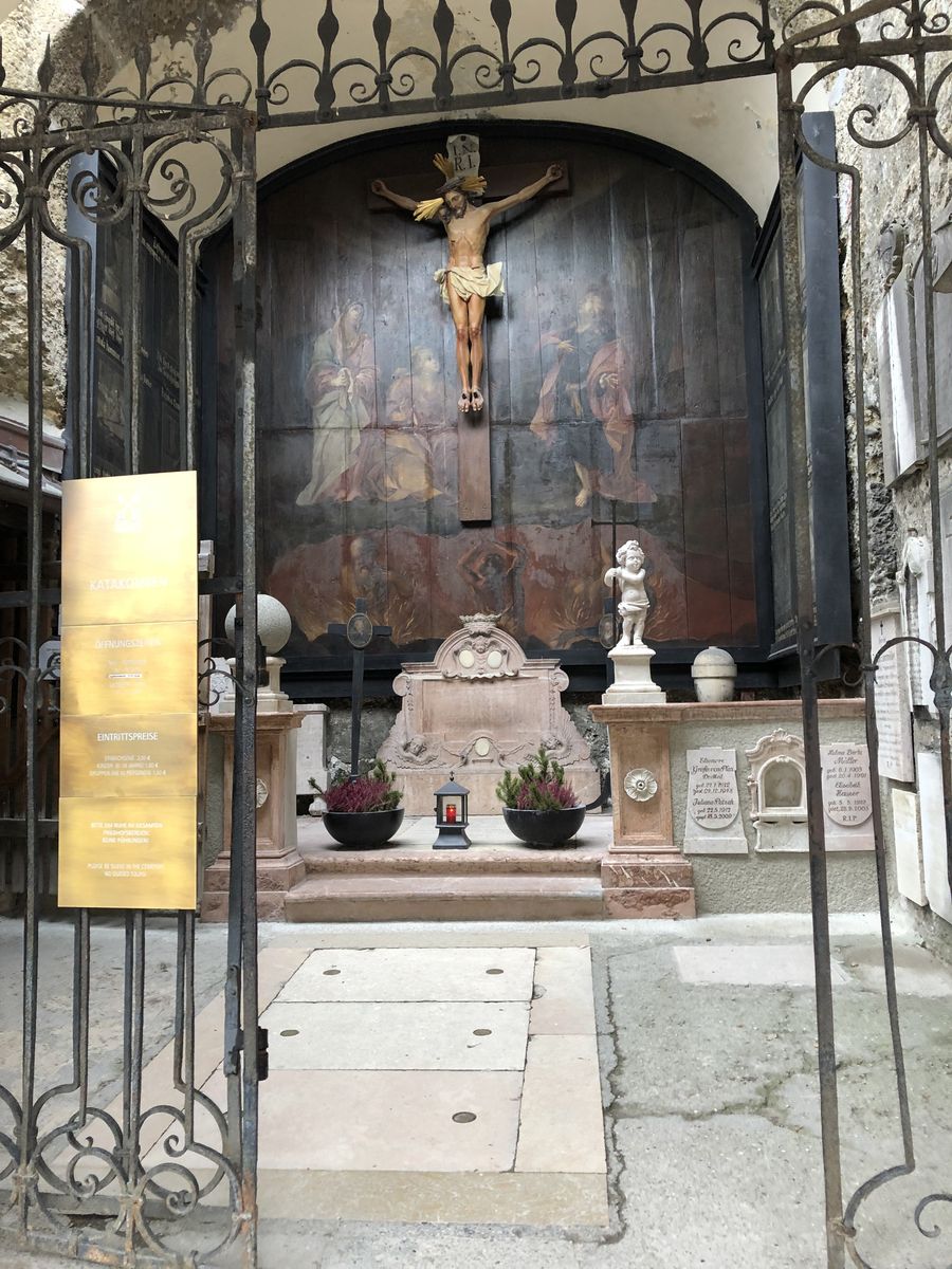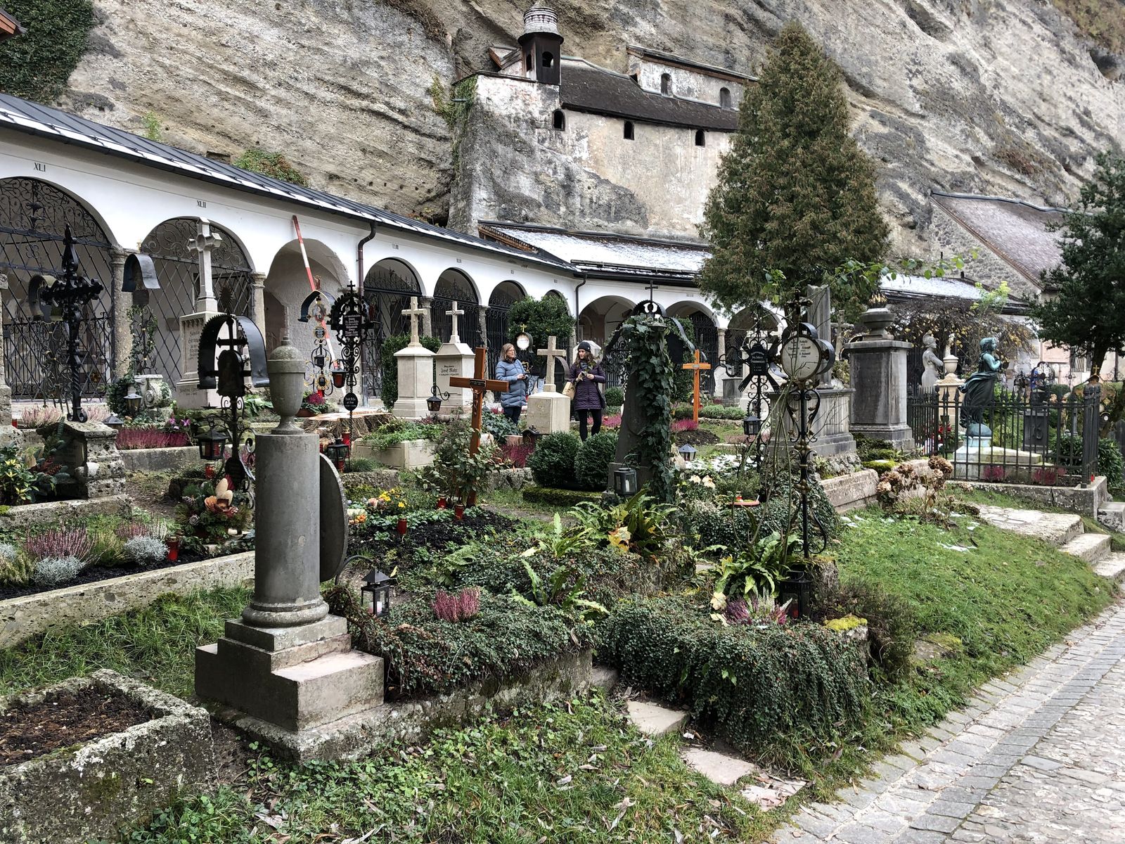 ザンクトペーター教会は,696年にこの場所に聖ルペルトが僧院を創設したことからはじまります。こうなると,日本の飛鳥や奈良と同等の歴史になります。ここはドイツ語圏で現存する最古の修道院なのです。墓地が隣接していて,この古い墓地は鉄細工の美しい墓碑と花々で飾らていました。また,モーツアルトの姉ナンネルの大きな墓のある場所から「カタコンベ」の洞窟に入ることができました。