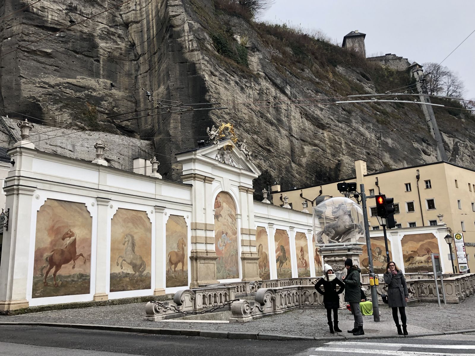 ところが,この劇場がなかなか見つからないのです。地図を見ながら歩いていたら,岩をくり抜いてできた通路に入ってしまって,-そこは駐車場の通路だったのですが- その長い通路を出たら,そこが「馬の洗い場」という場所でした。 「プフェルデの泉」ともよばれるこの場所は,かつては本当に宮廷の馬が洗われていた場所なのだそうです。そこからわずかばかり路地に入ったところが私の探していた祝祭劇場でした。