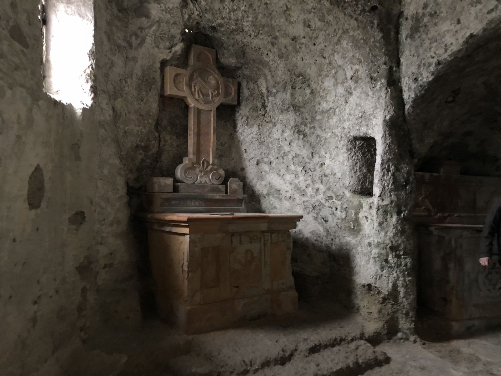 「カタコンベ」というのは地下墓所のことです。本来はローマの聖地セバスチアン教会の地下墓所を意味したのですが,のちに普遍化しました。帝政期のたびたびの迫害時にも官憲が破壊しなかったため,キリスト教徒の礼拝の場となりました。キリスト教が公認されたのちは地下の埋葬が行われなくなり,カタコンベは巡礼所となっていきました。キリスト教徒でない私はそんな歴史はまったく知らず,なにかおごそかな,しかし,神秘に満ちたところだという雰囲気しかわかりませんでした。