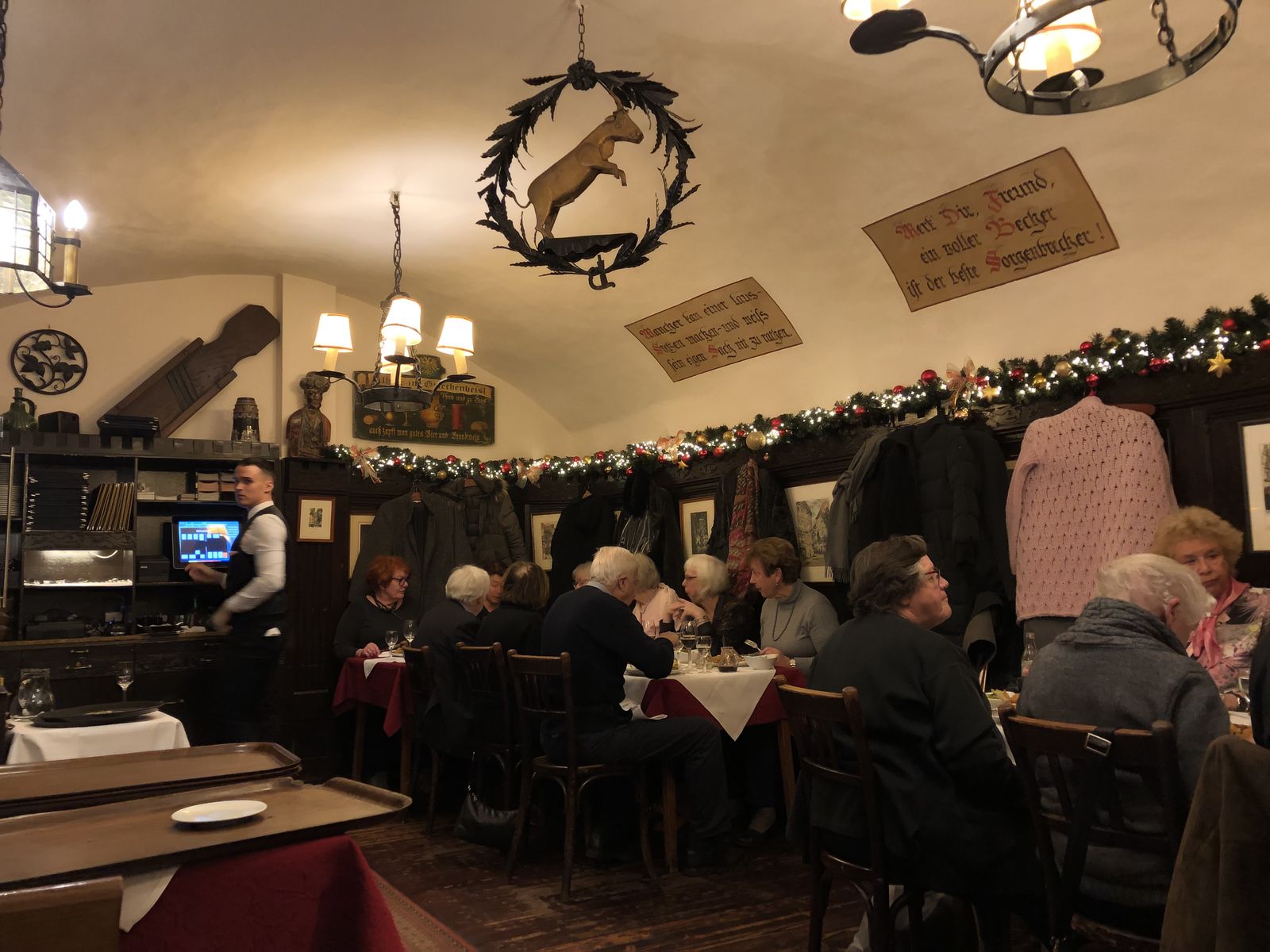このレストランにはいくつかの部屋があって,私の案内されたのは作曲家をはじめとした有名人のサインが壁一面にかかれたマークトウィンルームという部屋ではなく,初老の人たちのグループが楽しそうに会食をしていた部屋でした。料理が運ばれててくる間,この人たちの様子を見ていたらウィーンの人たちの人生が垣間見られて,興味深いものでした。