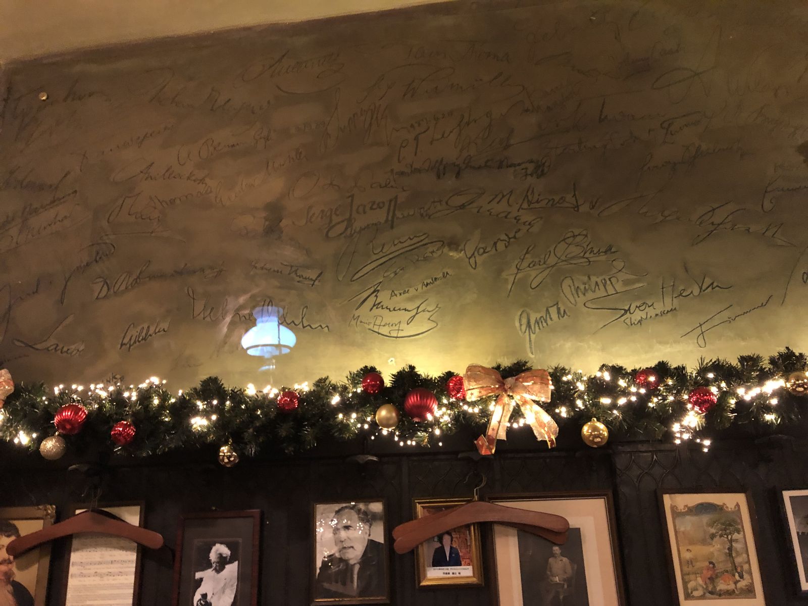 食事が済むとこのお店を紹介する日本語のパンフレットをもってきてくれました。会計を済ませたあとで,マークトウィンルームを見せてほしいというと案内してくれました。そこには壁一面にたくさんのサインが書かれていました。ベートーヴェンはどれかというと指示してくれました。