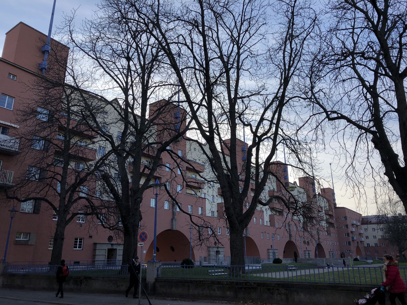 今日まず向かったのがフンデルトヴァッサーハウスでした。画家で建築家のフンデルトヴァッサーが1986年に建築した公共住宅です。「自然との共生」がテーマで作られた奇抜なデザインのアパートを見てみたかったのです。ウィーン市街地の北東の住宅街にあって,地図を見たらミッテ駅まで行けば近くに思えたので,ミッテ駅まで地下鉄U4で行って,そこから歩きました。