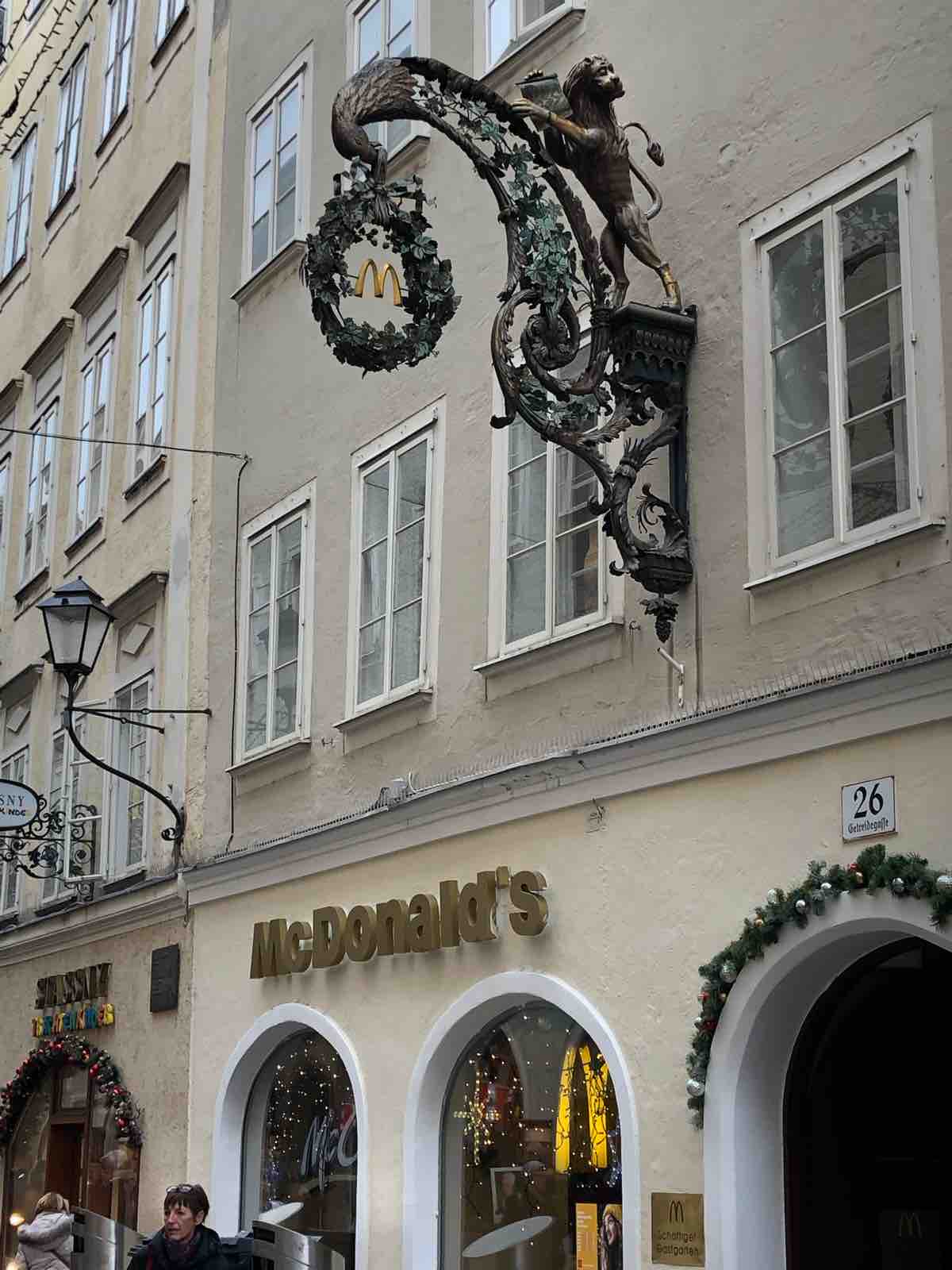 モーツアルトの生家を出たところからゲトライデガッセという小径が続いていて,狭い通りの両側には隙間なく鉄細工の看板が掲げらているのですが,一番の見ものはマクドナルドの看板でした。その小径は多くの観光客で賑わっていて,その流れは東に向かっているのですが,私は西に歩いて,近代美術館を目指しました。