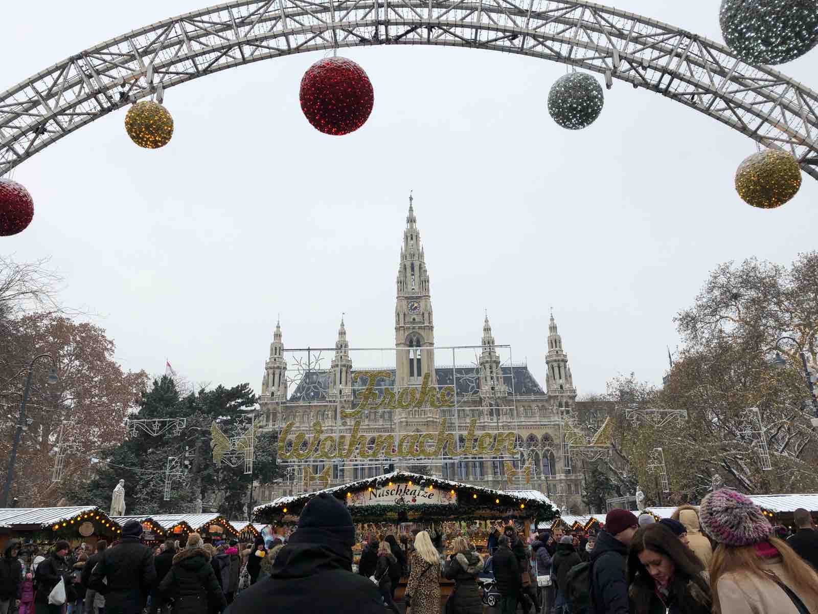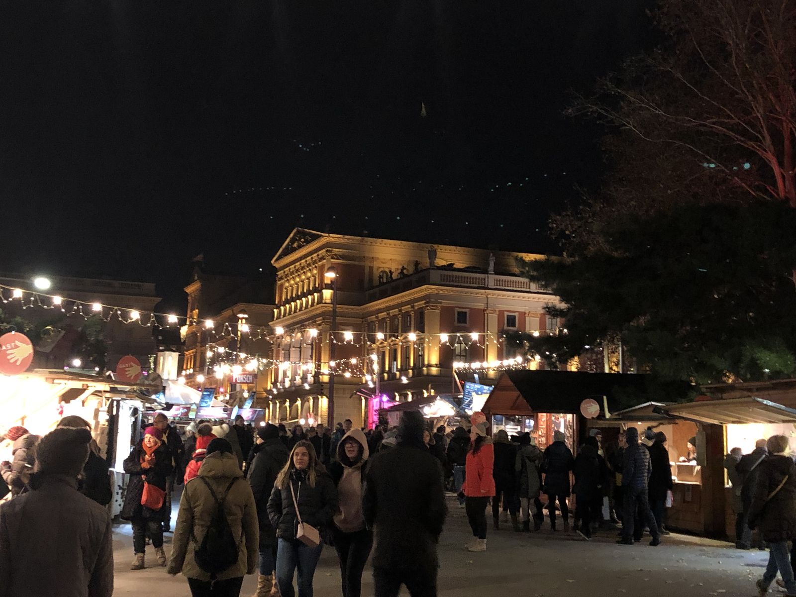 市庁舎前の広場はクリスマスマーケットで多くの人がいました。私ははじめてウィーンに来たのに,こんな素敵な季節で,どこに行ってもクリスマスマーケットで賑わっていたので,幸か不幸かこれが普段のウィーンだという印象を抱いてしまったのですが,おそらくこのときが特別だったのでしょう。
