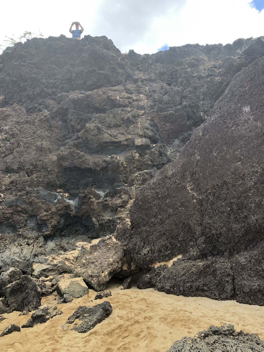 北の海岸線も3年前にすでに走りましたが,そのときに見過ごしたところがないかと走っていくと,州道19号線を離れて右折すると海岸ぞいの展望台に出る狭い道があったので,そこに入ることにしました。狭い道路を延々と走っていくと,やがて,海岸ぞいの断崖にでました。結構な車が道路わきにとまっていたので,私も車を停めて,トレイルをしばらく歩くことにしました。それが今日の写真ですが,ハワイというのはこの場所にかぎらず,ビーチよりもこうした断崖のほうが多いものです。