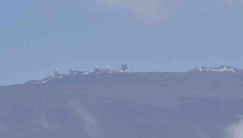 フードコートを出て,東のほうに目を転じると,そこに見えたのが晴れ渡ったマウナケア山でした。山頂にはたくさんのドームが光っていました。そこで思い出したのですが,3年前に,マウナケア山頂にあるすばる望遠鏡のドームがどこからで見られると思ってハワイ島に出かけた私ですが,マウナケア山の中腹にあるオニヅカ・ビジターセンターまで行ってもドームは見られず,私がはじめてすばる望遠鏡のドームを見ることができたのは,ビジターセンターを越えて,4,205メートルのマウナケア山頂まで行ったときでした。