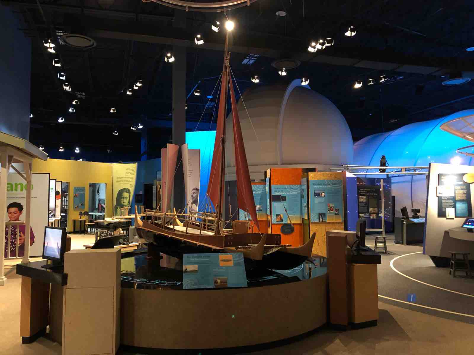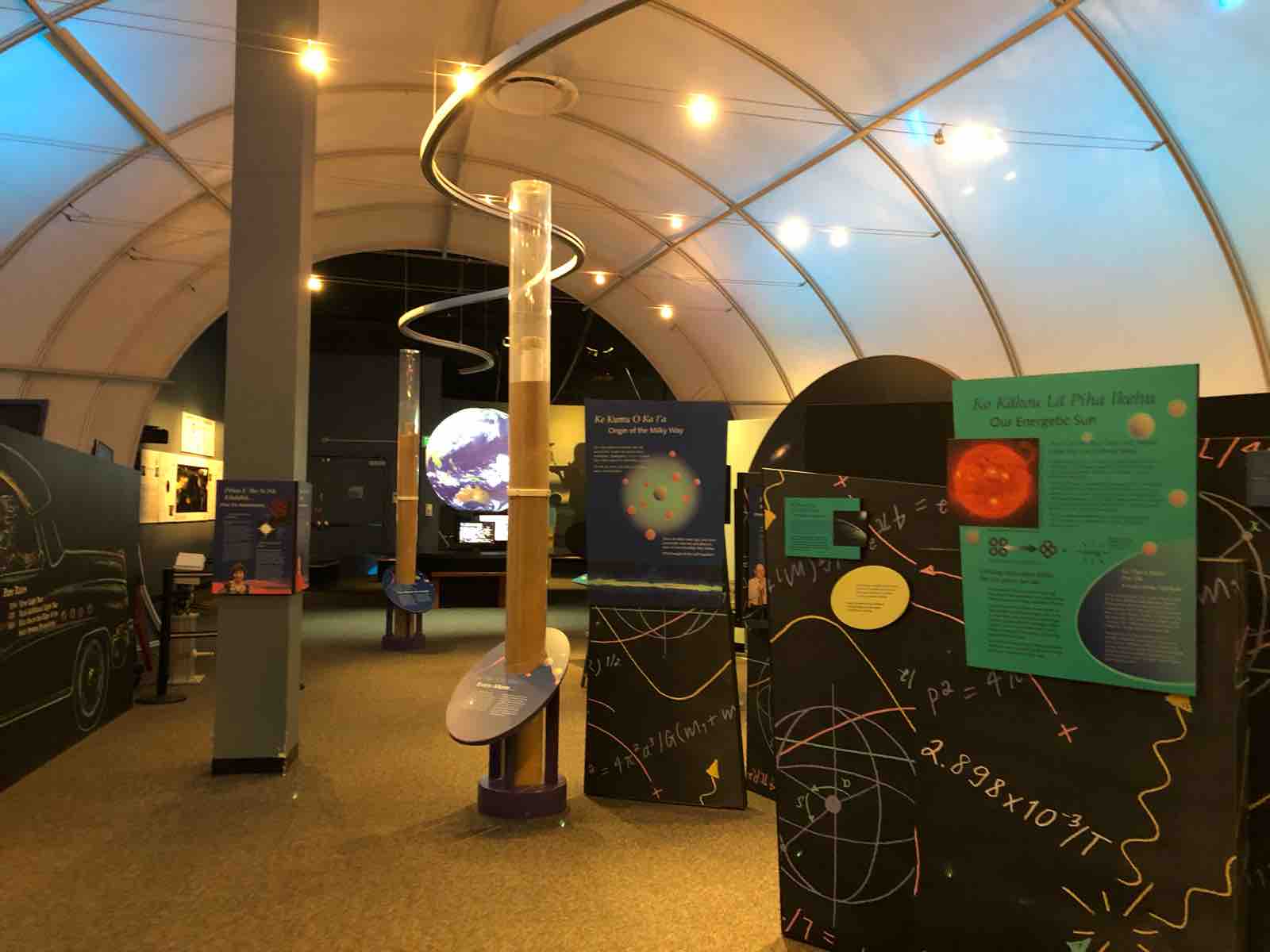 日本の誇るすばる望遠鏡もハワイ島マウナケア山頂にあります。望遠鏡はコンピュータによる自動制御が行われるので,観測の拠点は強風吹き荒ぶ山頂4,205メートルから下界に降りたハワイ大学のヒロ校舎にあります。そこで啓蒙活動のために同じ構内にこのイミロア・アストロノミー・センターがあるのです。