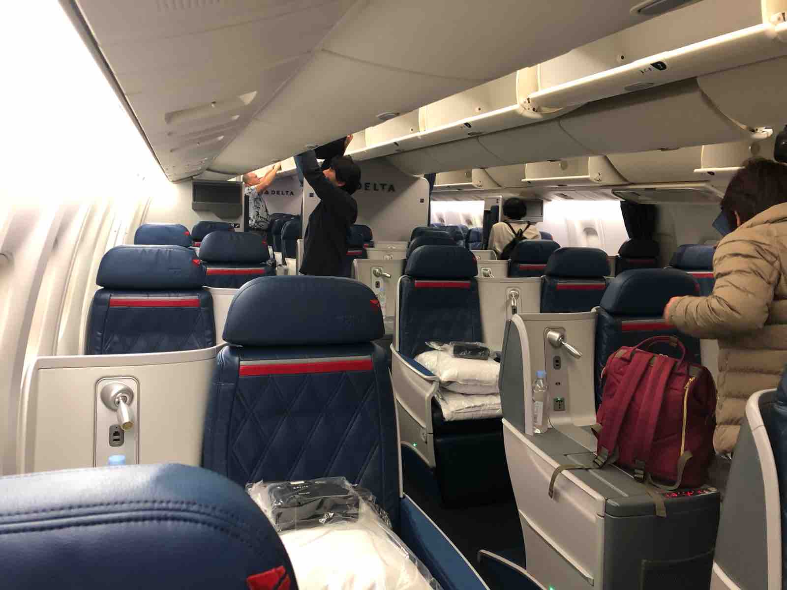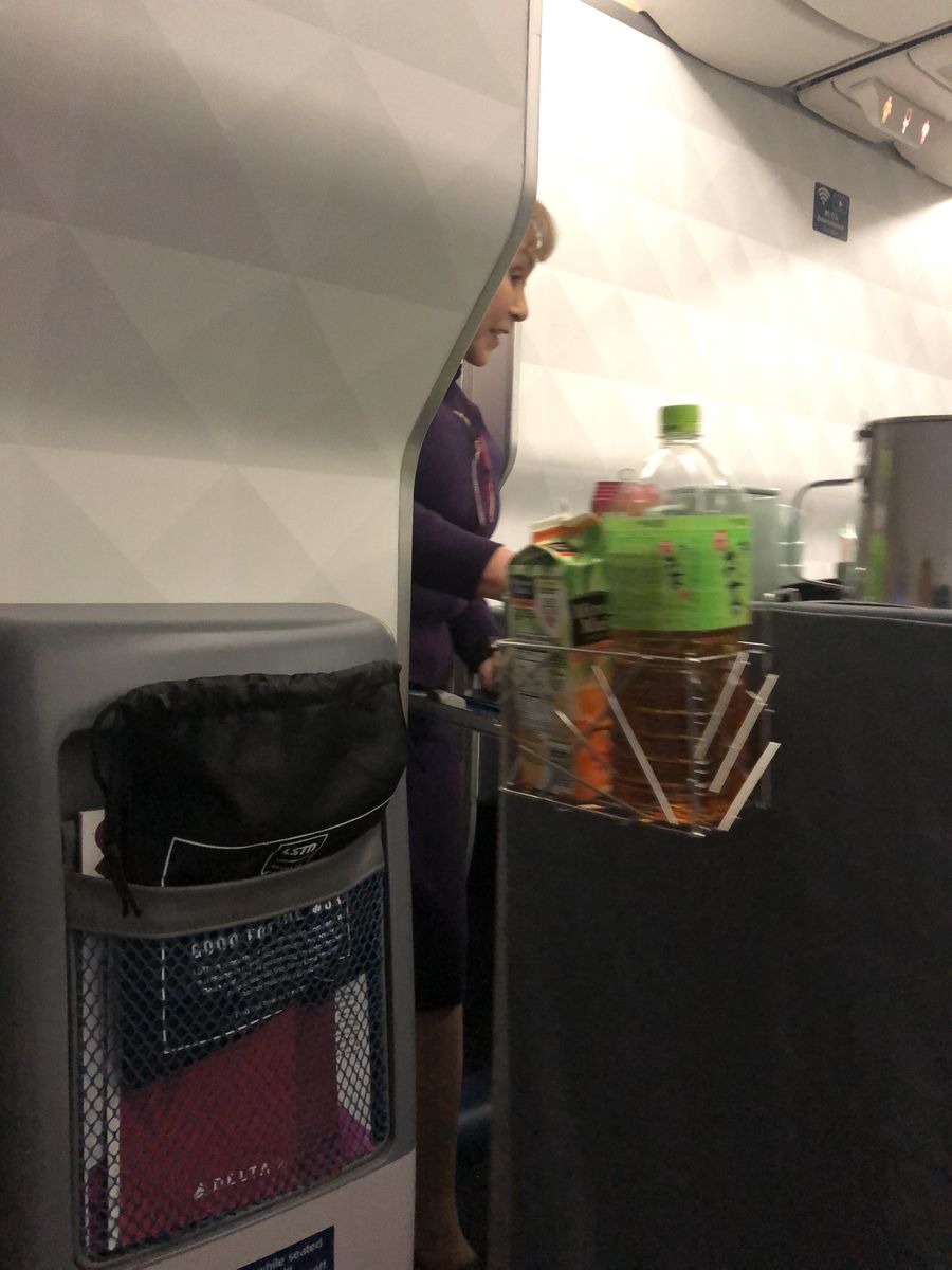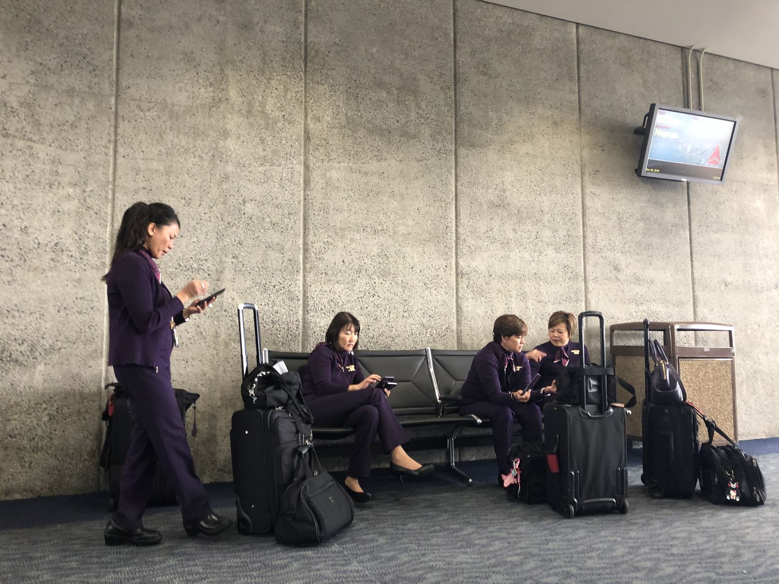 やがて搭乗時間がきたので,ラウンジを出てゲートまで行ったのですが,あいにく30分ほど搭乗開始時間が遅れていました。私の座った座席の前には,手持ちぶさたそうにデルタ航空の客室乗務員が搭乗を待っていました。