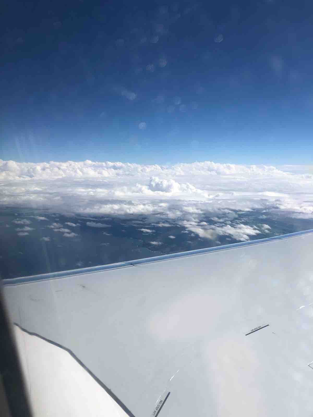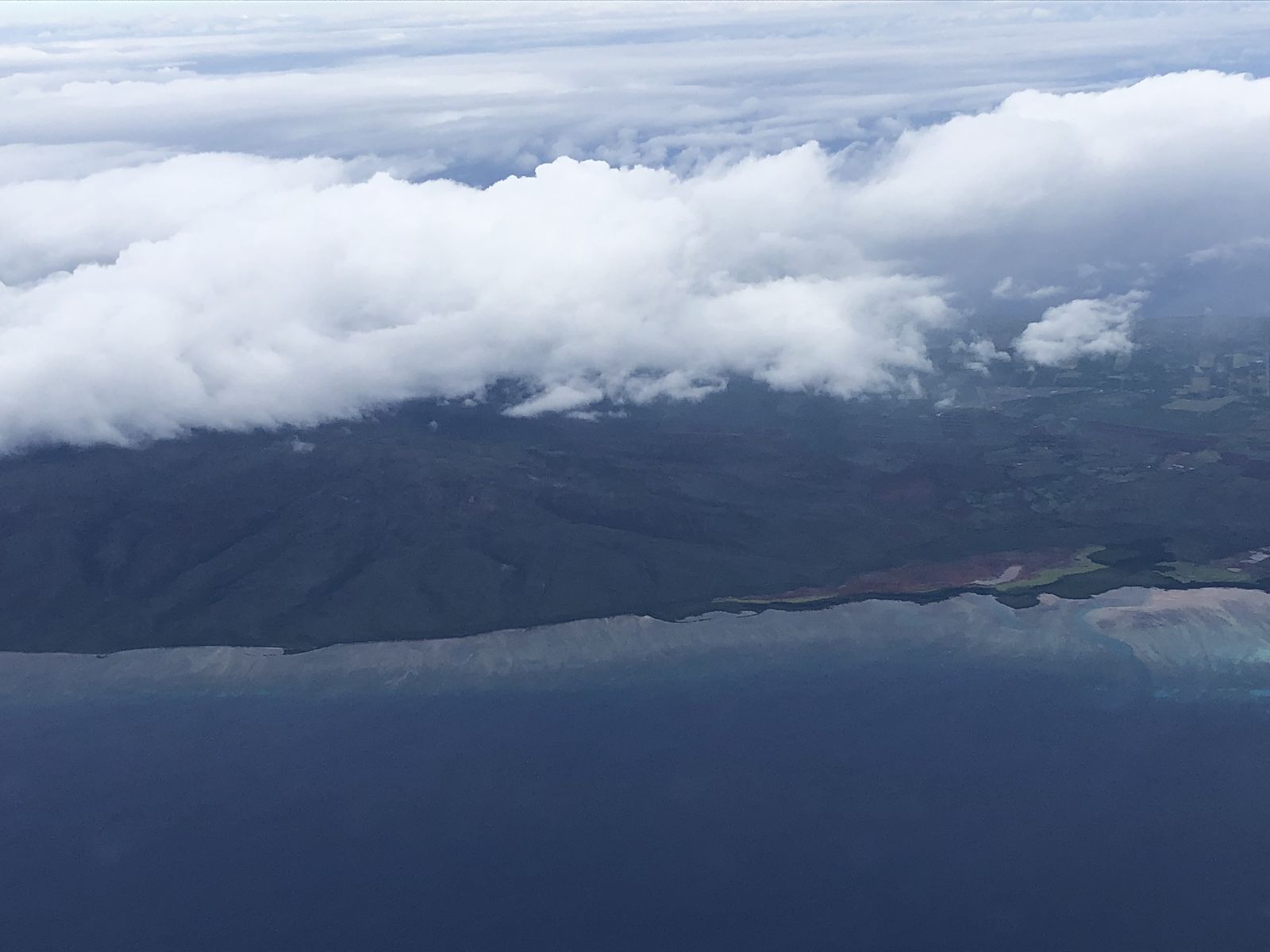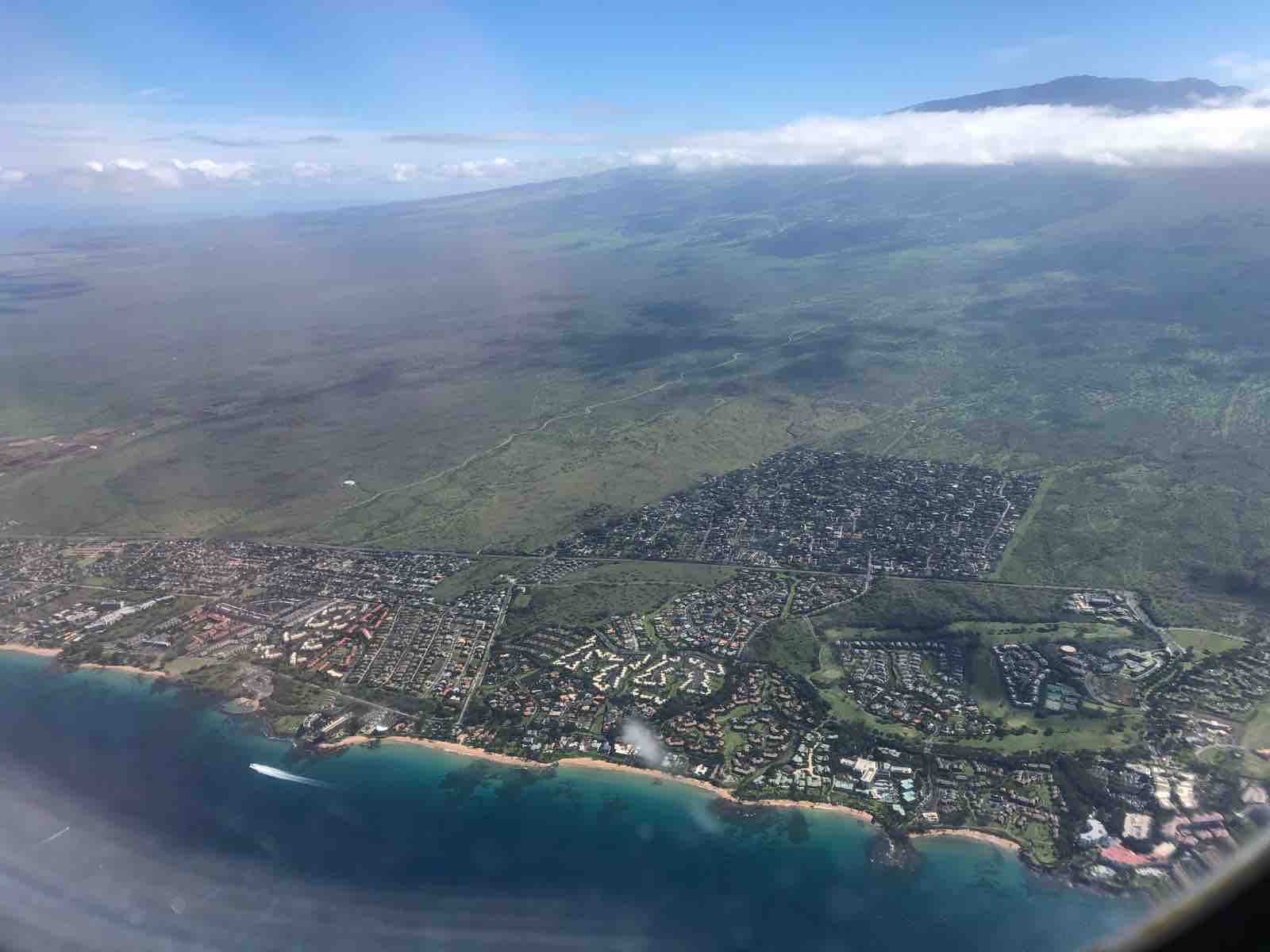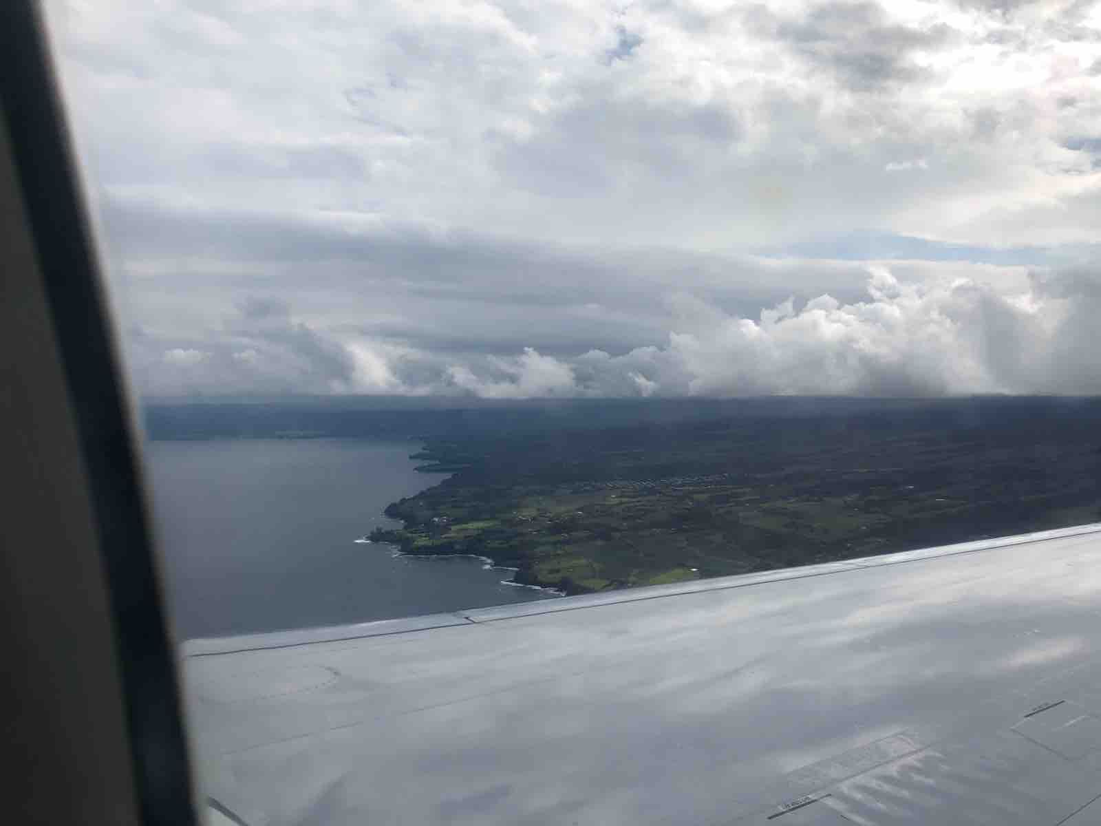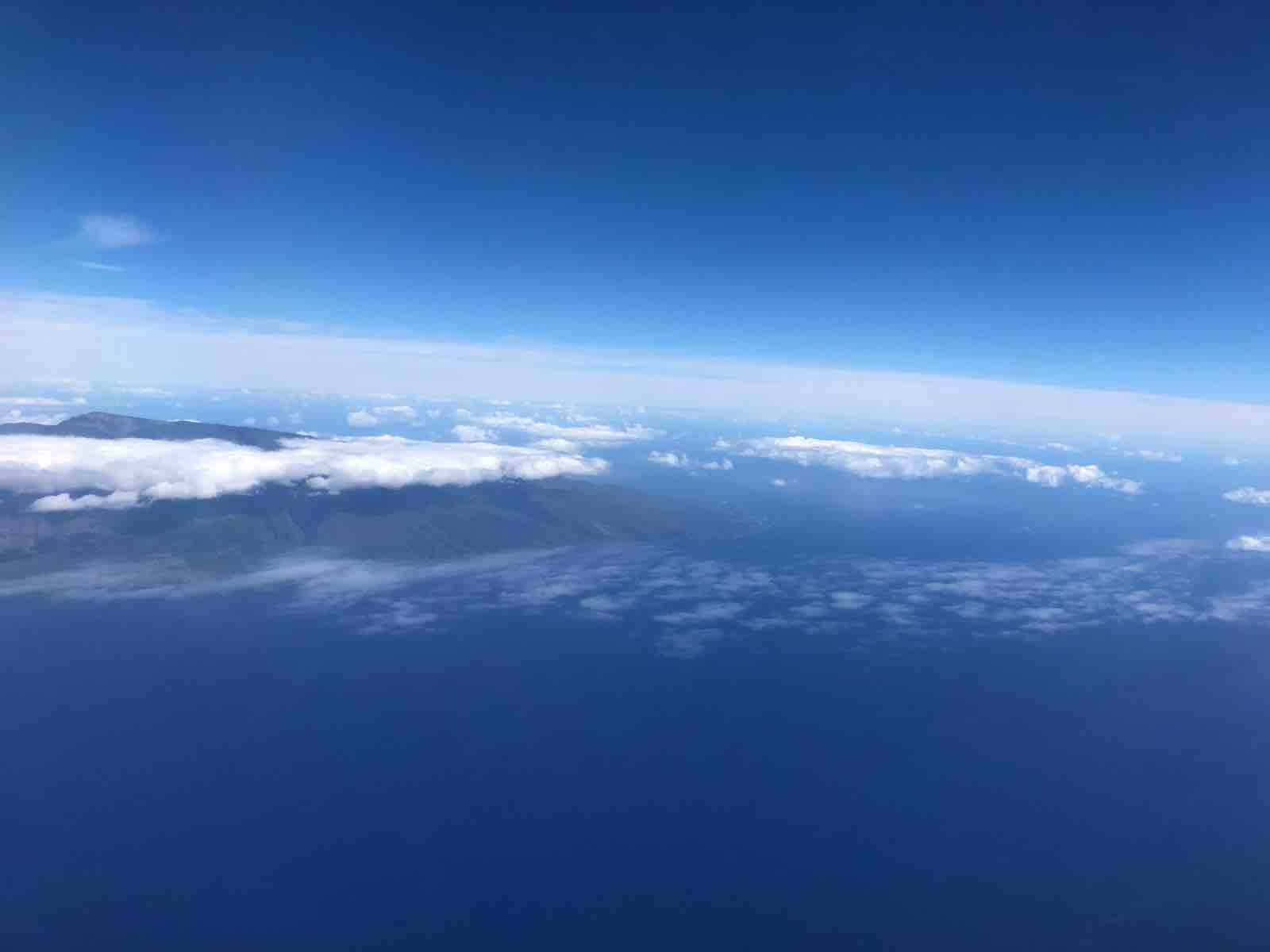わずか3年とはいえそれも遠い昔のこと。今回はすべてがすんなりとあっけなく過ぎていきます。ハワイアン航空は窓際席を選んだので眼下にハワイの島々が見えてきました。残念だったのは雲が多いことでした。