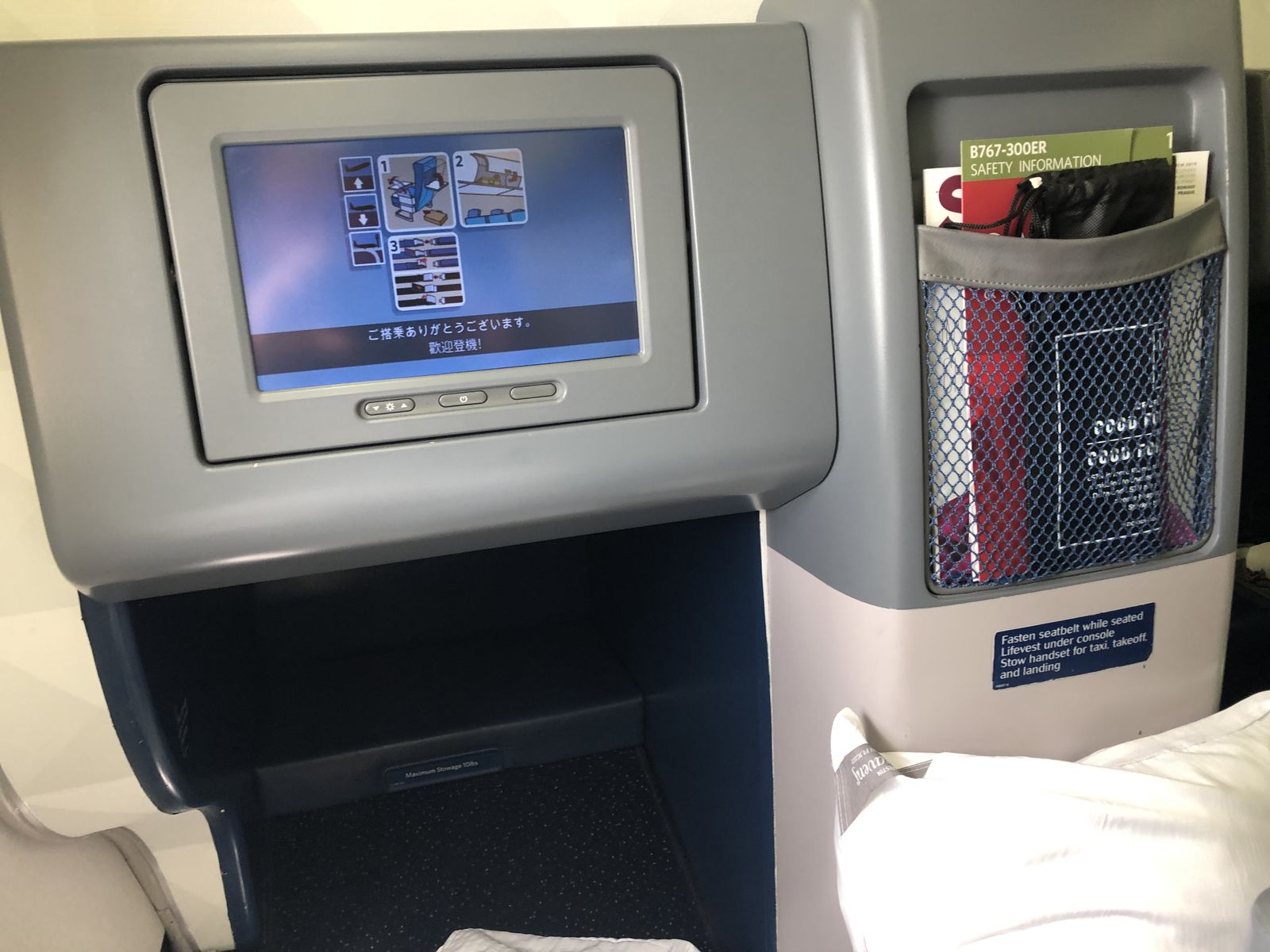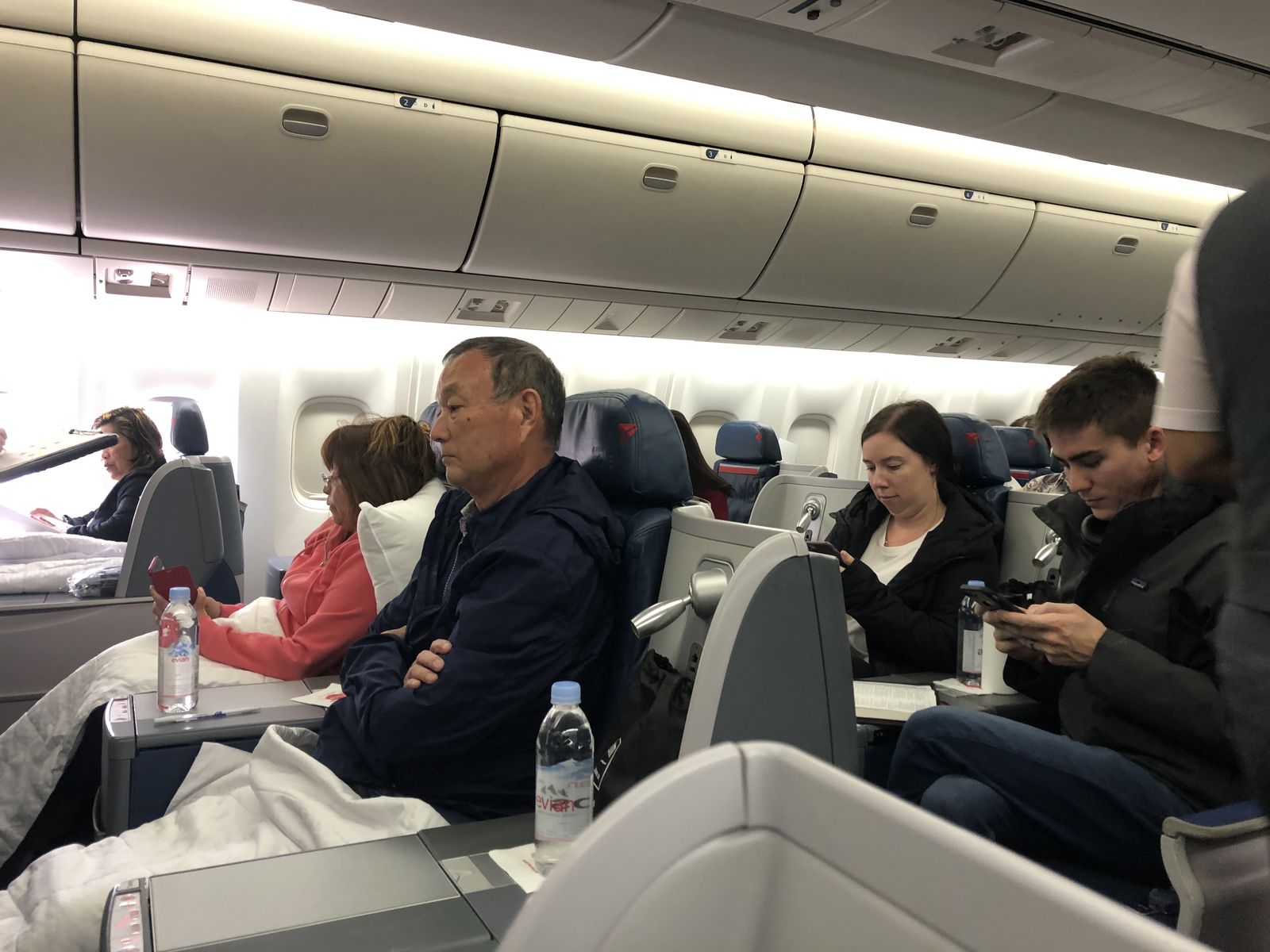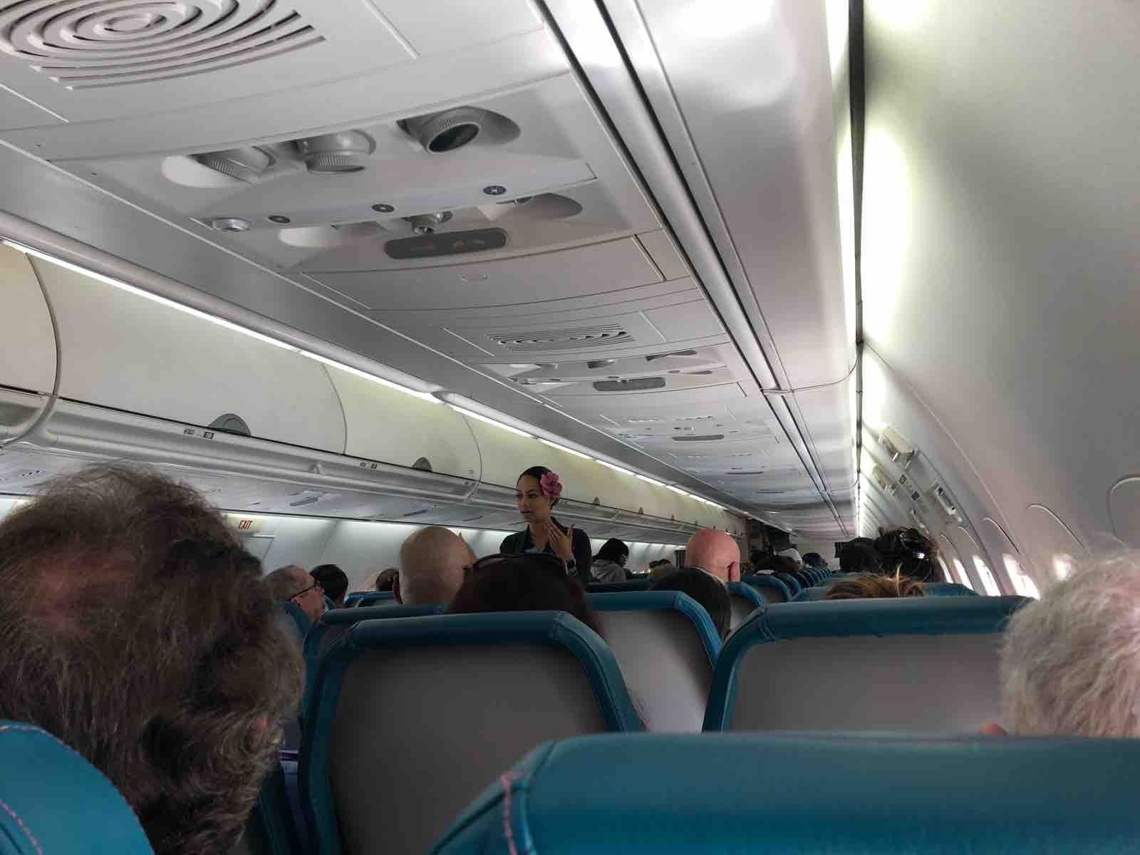 私が座っていたのは最前列右側の窓際でしたが,左にはハワイに住んでいるという男性,その後ろ中央2列前後に4人組の60歳になるというグループ旅行でウキウキの女性たち,そして,私の後ろが1歳の男の子を連れた女性でした。