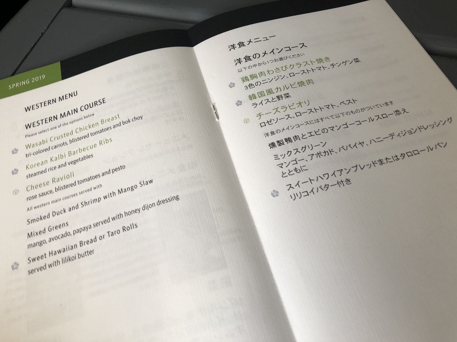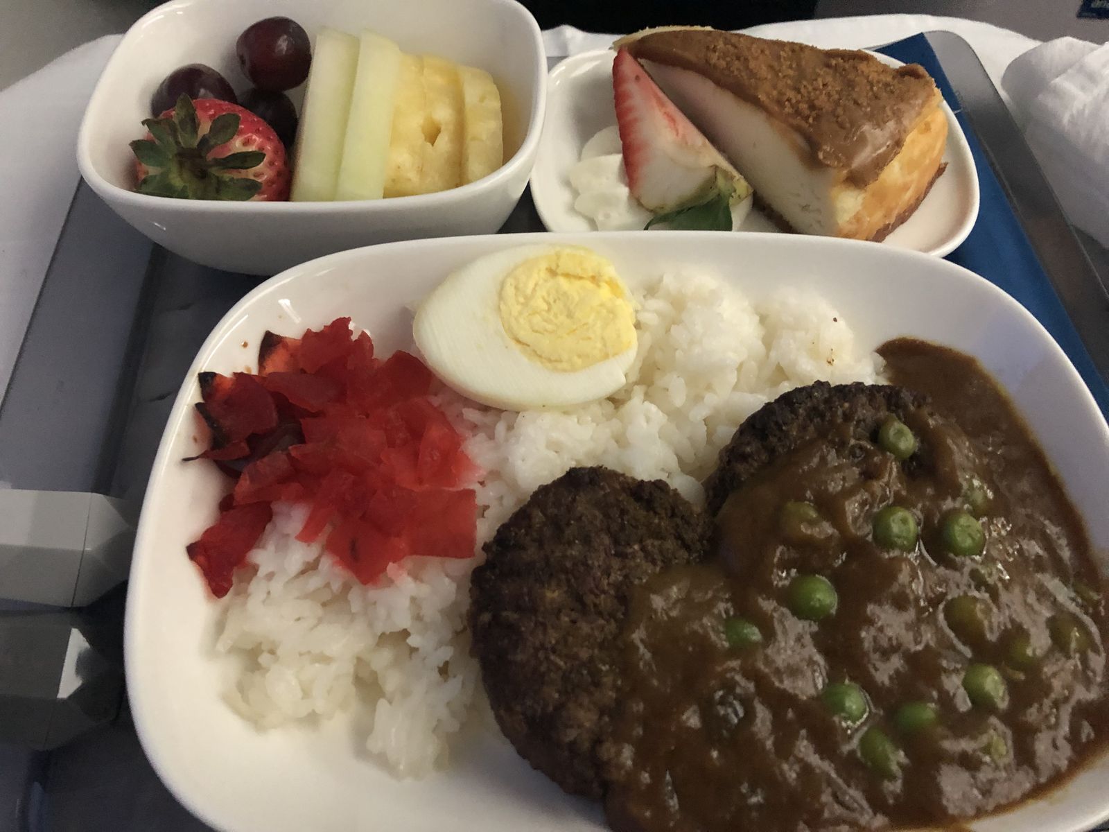 行きと同じく,フルコースの夕食が出ました。行きのときは和食にしたので洋食を選択したのですが,行きに見たのとメニューが違いました。考えてみれは,行きは2月のメニューで帰りは3月のメニューだったのです。そのあとアイスクリームが出て,さらに,朝食にカレーライスが出ました。