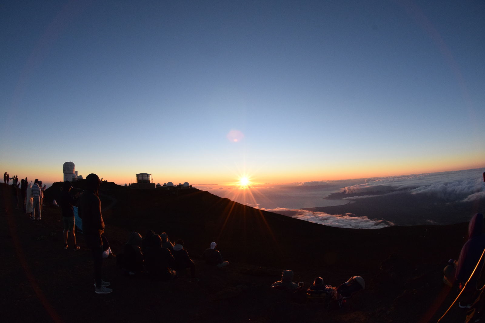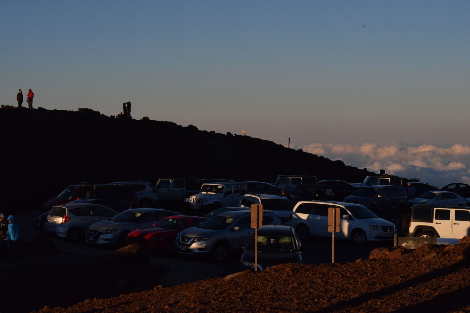 まだ日の入りには1時間以上あるのにもかかわらず,ハレアカラ山頂はすでに夕日を見る人たちでごった返していて,車を停める場所を見つけるのにも苦労しましたが,なんとか車を停めて,車内で夕食を食べながら夕日が沈むのを待ちました。日没の時間が近づいたので車から外に出ました。