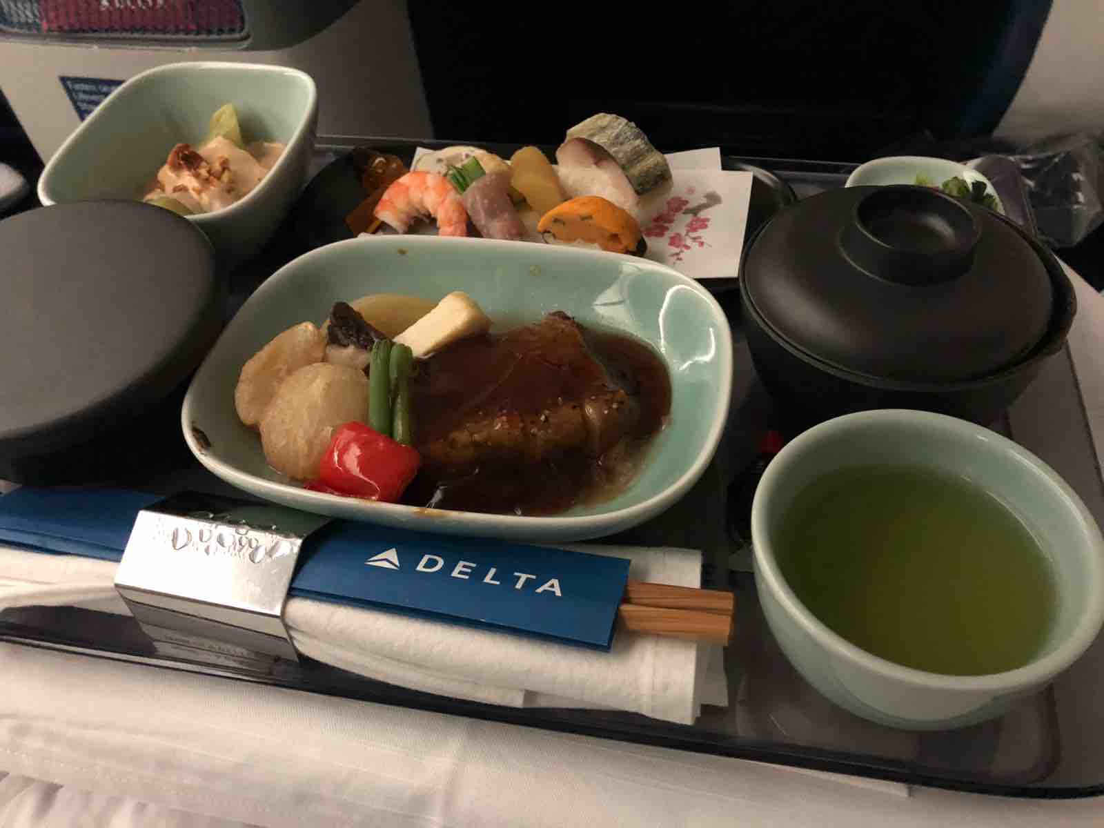ファーストクラスで楽なのは座席がフルフラットになることです。食事は和食を選びました。帰りは洋食にしましょう。食事の後にはアメリカ人定番のアイスクリーム,そしてコーヒー。これが夜の10時に出てくるのだからさすがに食べ過ぎです。到着までにブタになりそうです。