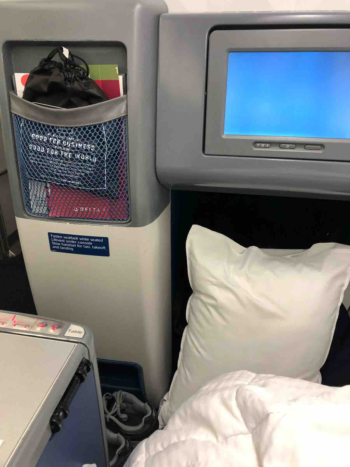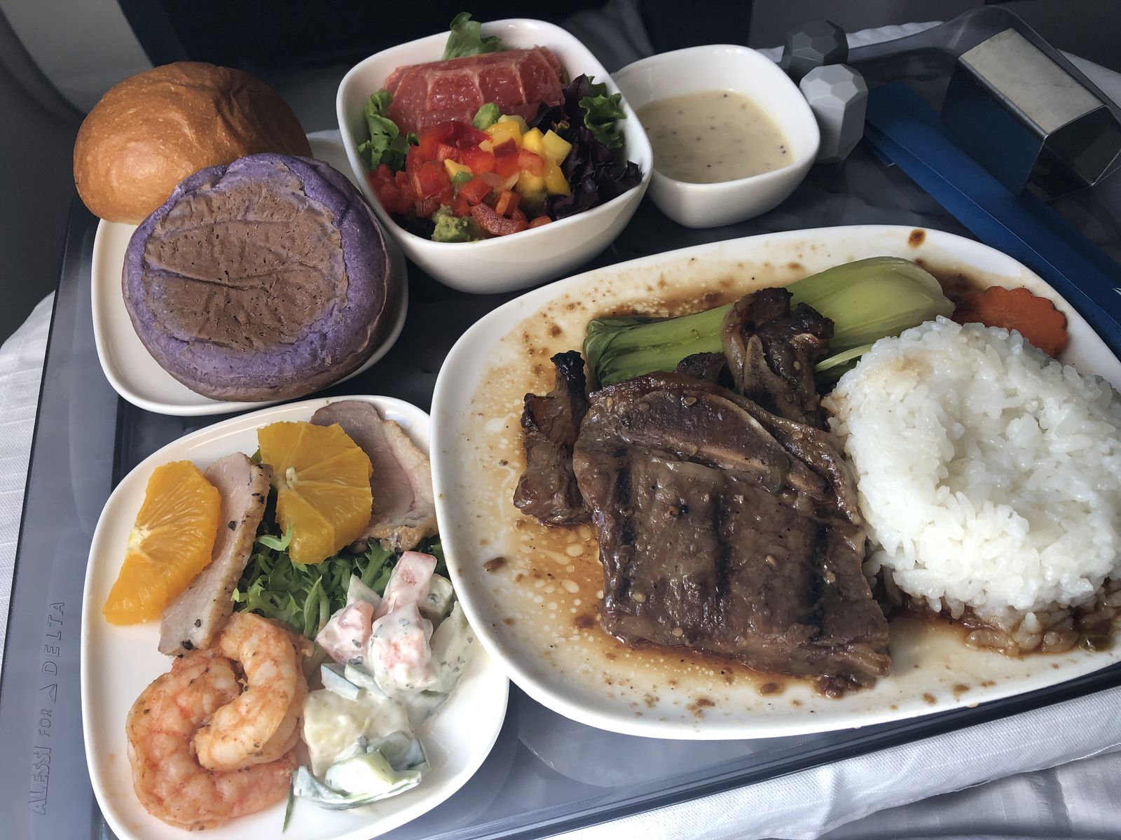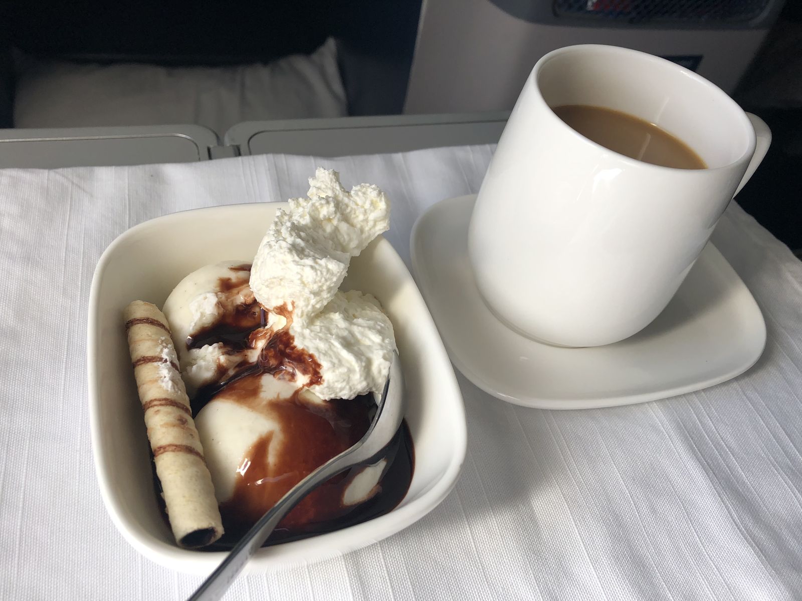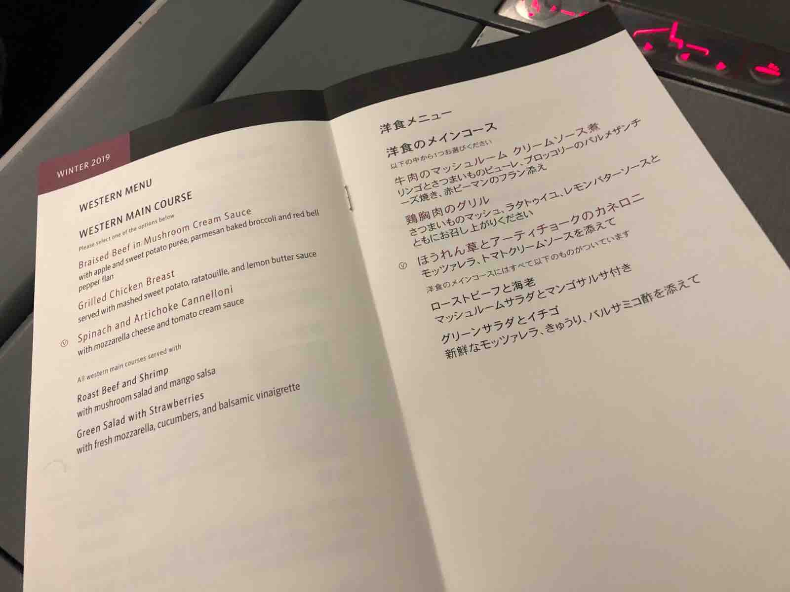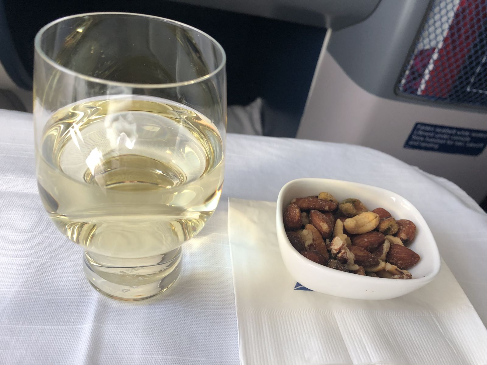 座席に着くと私の担当の客室乗務員(こういう席はお客さんごとに特定の客室乗務員が担当になります)が以前もご一緒しましたね,と言いました。私は覚えがなかったのですが,そんなこんなで,特に私に親切でした。私も調子に乗って普段は飲みもしないのに白ワインなどを頼んでしまい,いい気になりました。